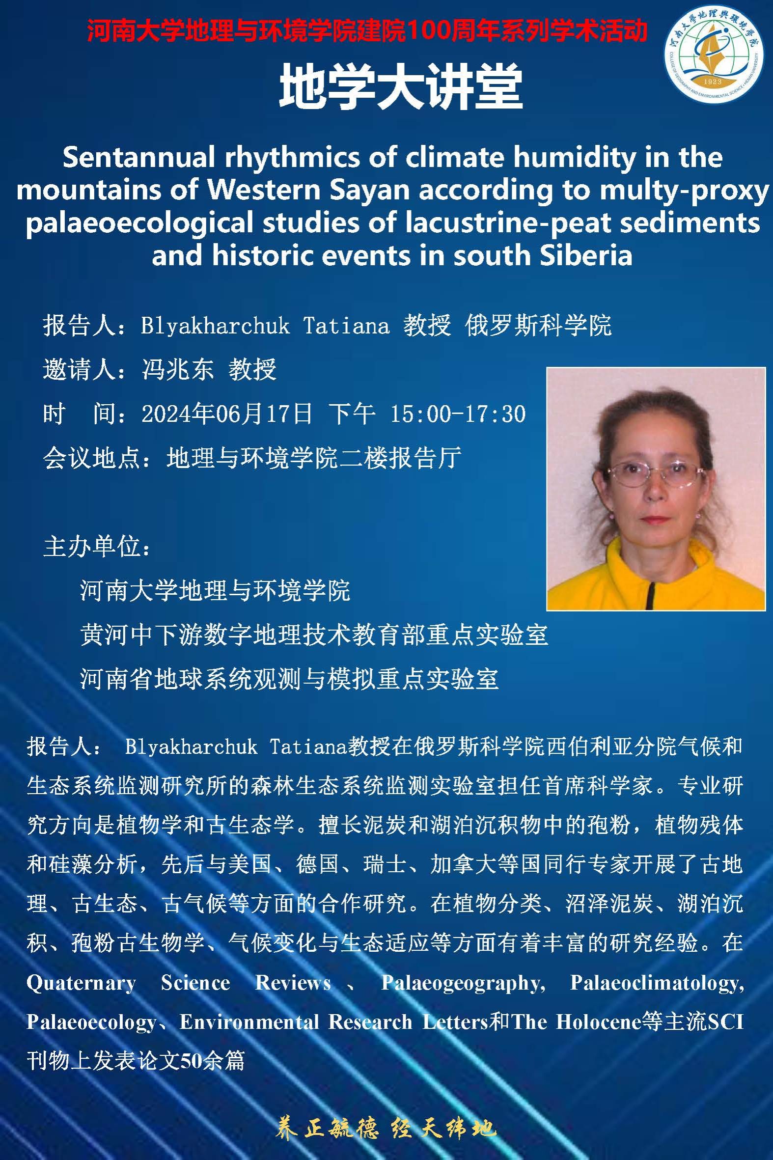 Blyakharchuk Tatiana :Sentannual rhythmics of climate humidity in the mountains of Western Sayan according to multy-proxy palaeoecological studies of lacustrine-peat sediments and historic events in south Siberia(时间:6月17日)