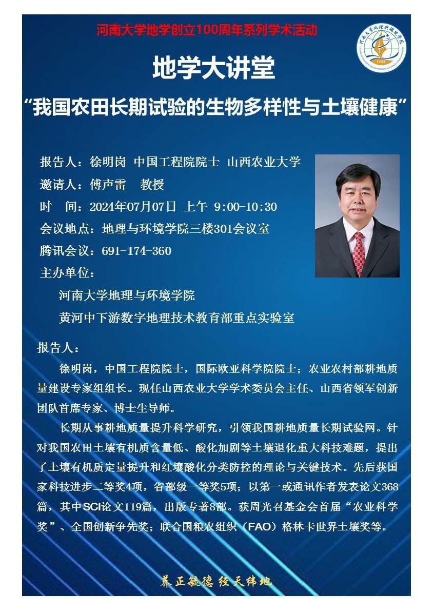 徐明岗:我国农田长期试验的生物多样性与土壤健康(时间:7月7日)