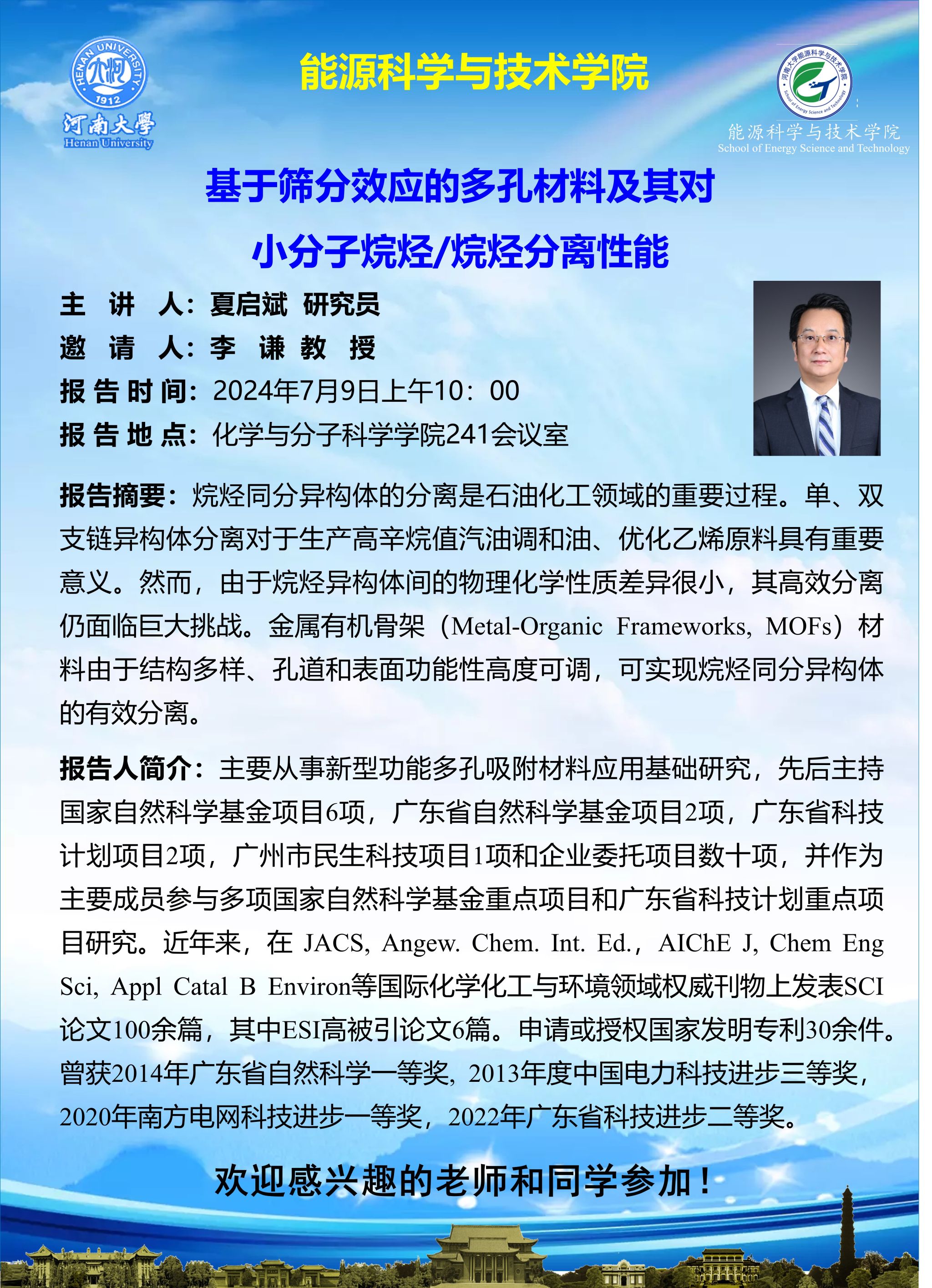 夏启斌:基于筛分效应的多孔材料及其对小分子烷烃/烷烃分离性能(时间:7月9日)