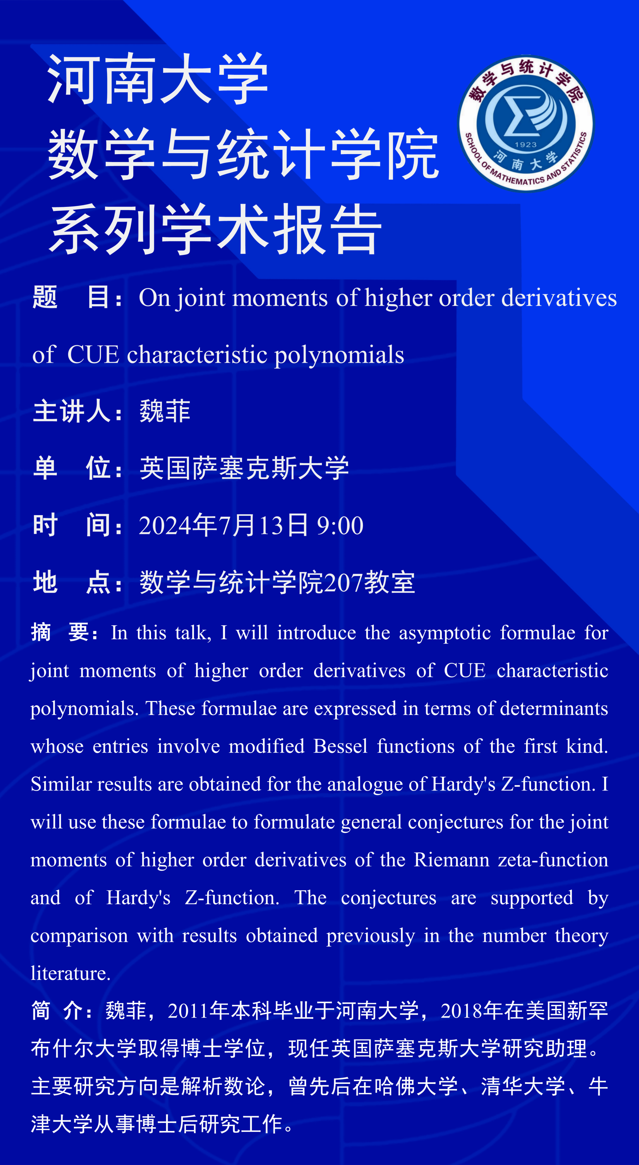 魏菲:On joint moments of higher order derivatives of CUE characteristic polynomials(时间:7月13日)