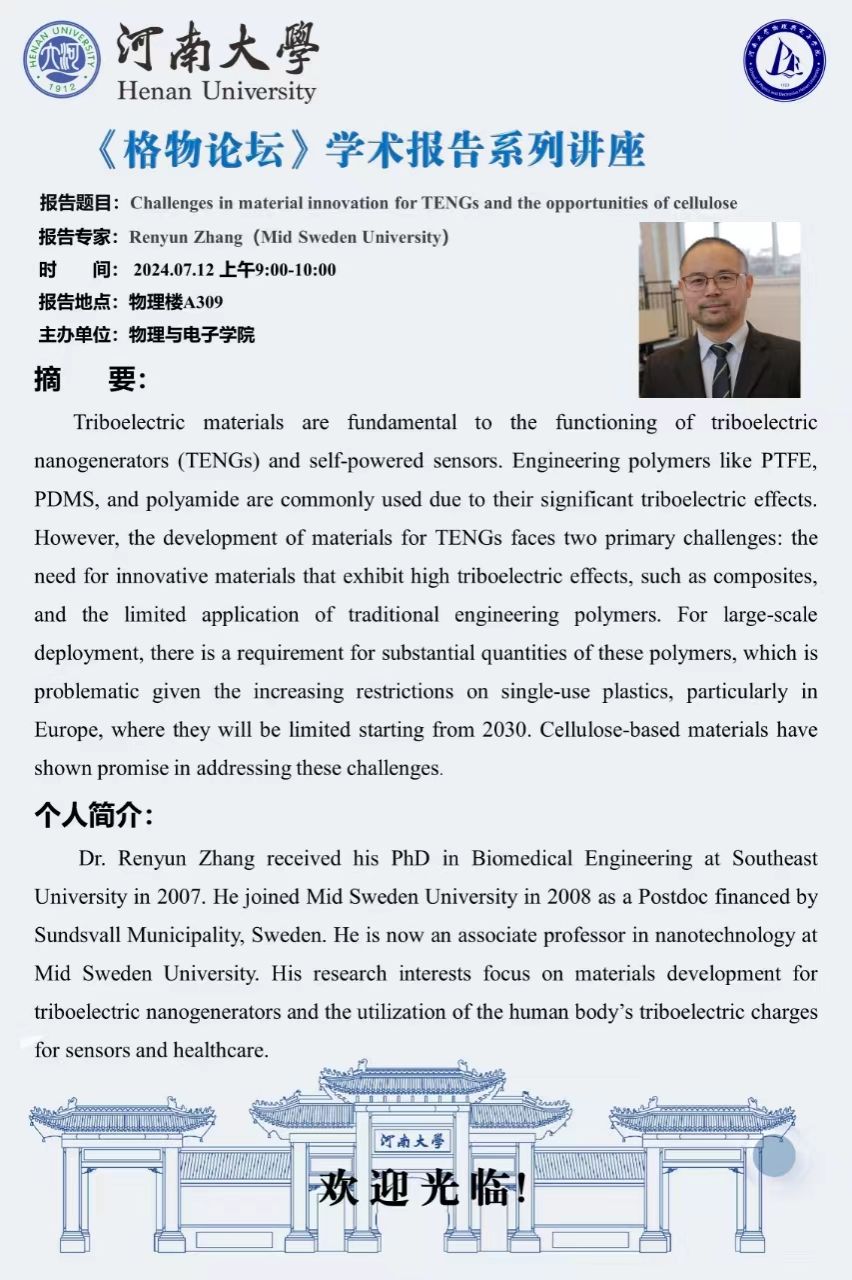 张仁云:Challenges in material innovation for TENGs and the opportunities of cellulose(时间:7月12日)