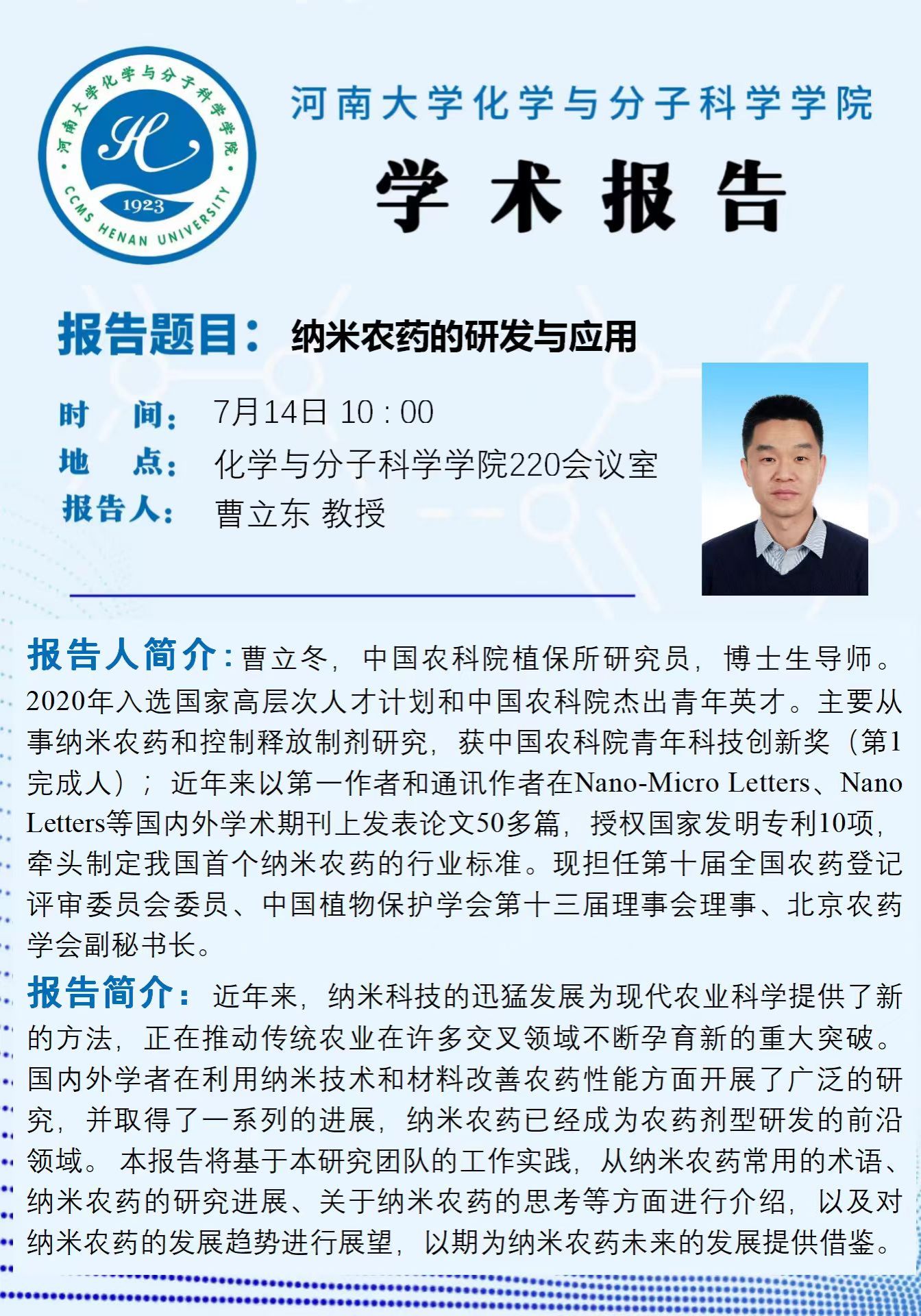 曹立东:纳米农药的研发与应用(时间:7月14日)