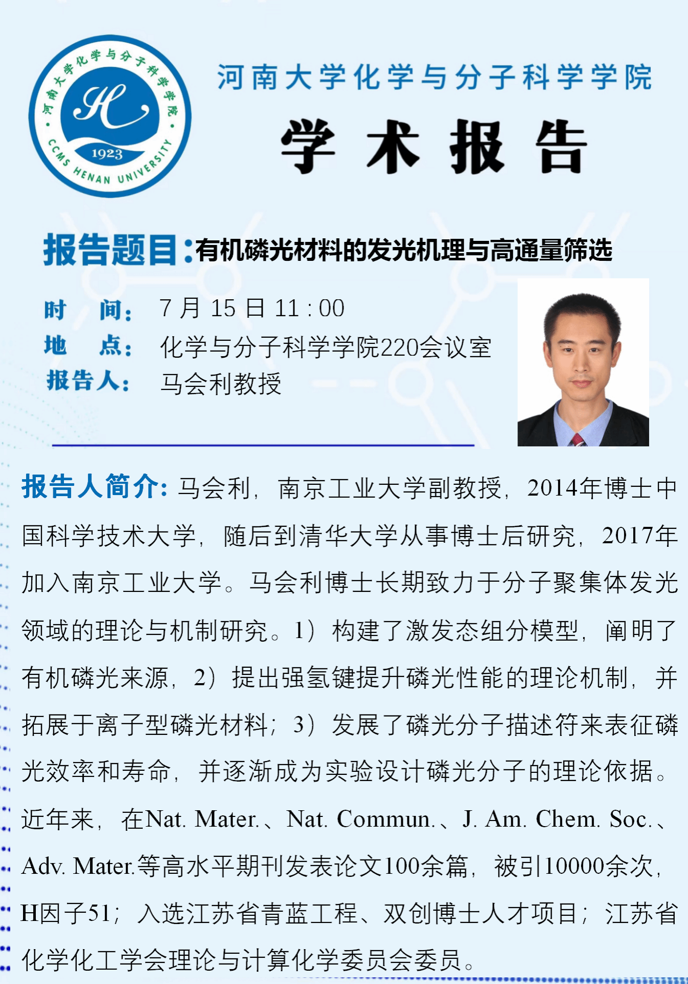 马会利:有机磷光材料的发光机理与高通量筛选(时间:7月15日)