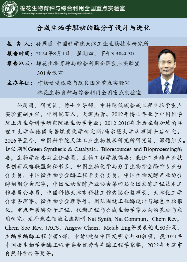 孙周通:合成生物学驱动的酶分子设计与进化(时间:8月1日)