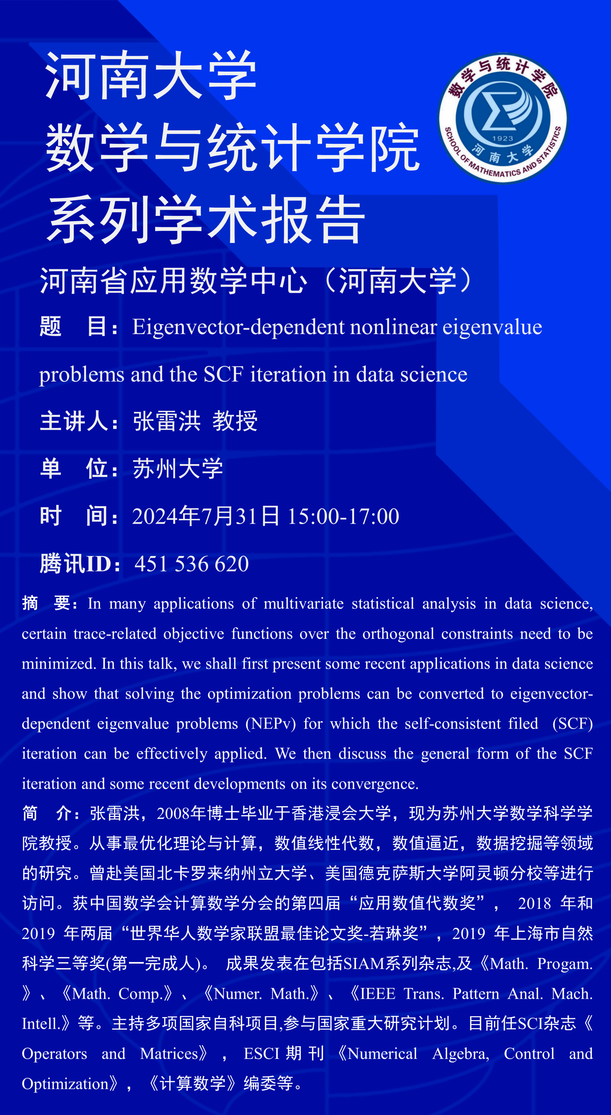 张雷洪:Eigenvector-dependent nonlinear eigenvalue problems and the SCF iteration in data science (时间:7月31日)