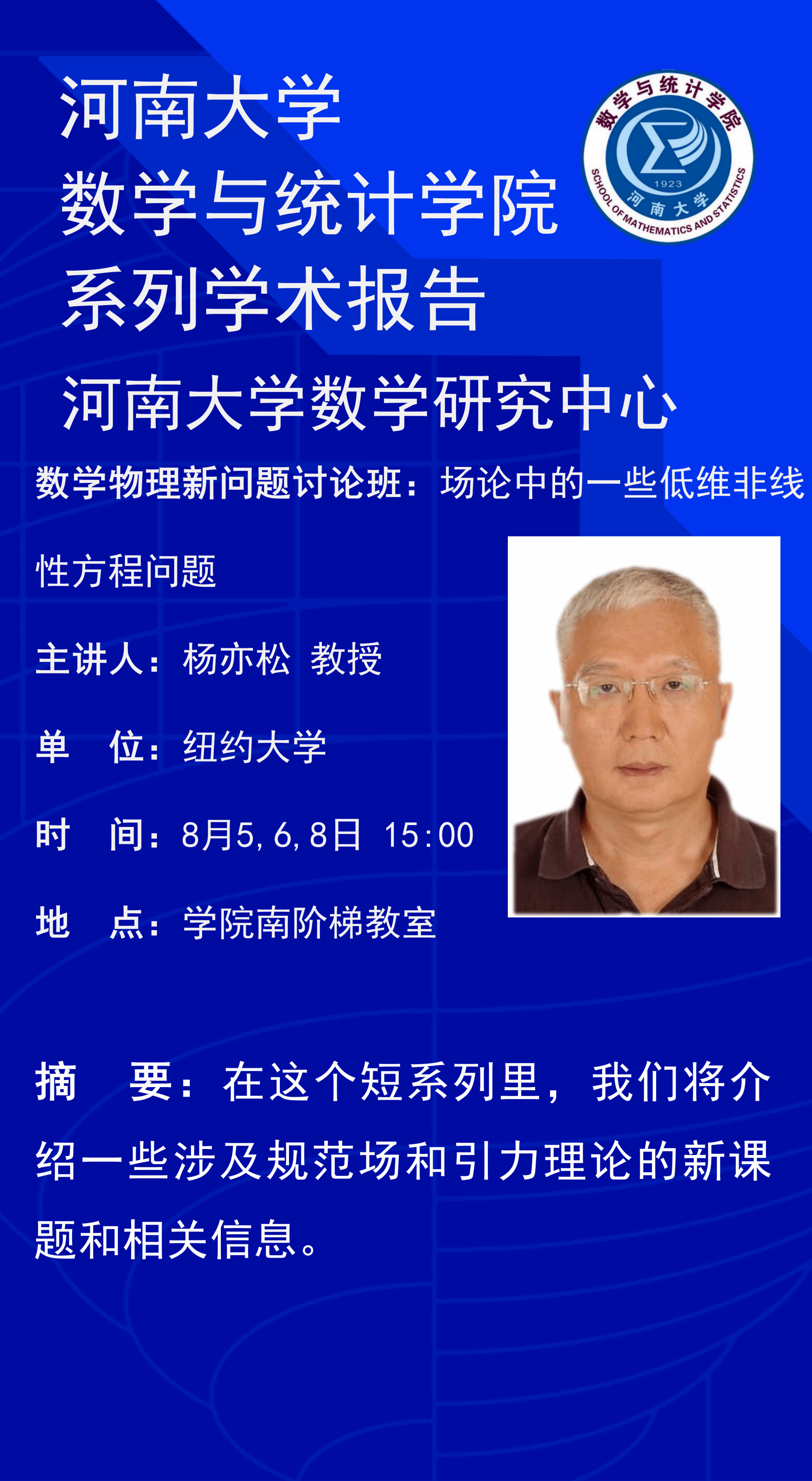 杨亦松:数学物理新问题讨论班:场论中的一些低维非线性方程问题(时间:8月5,6,8日)