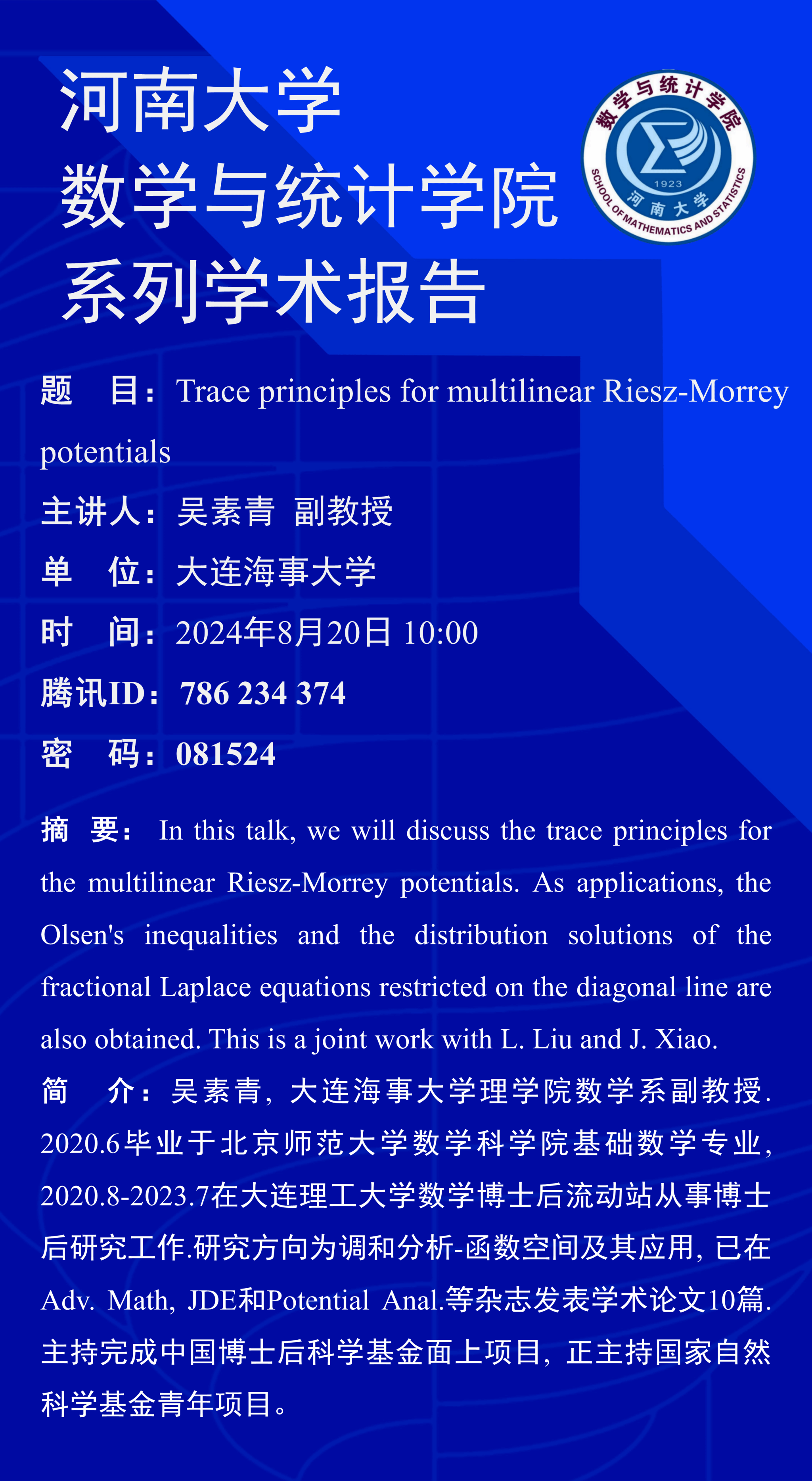 吴素青:Trace principles for multilinear Riesz-Morrey potentials(时间:8月20日)