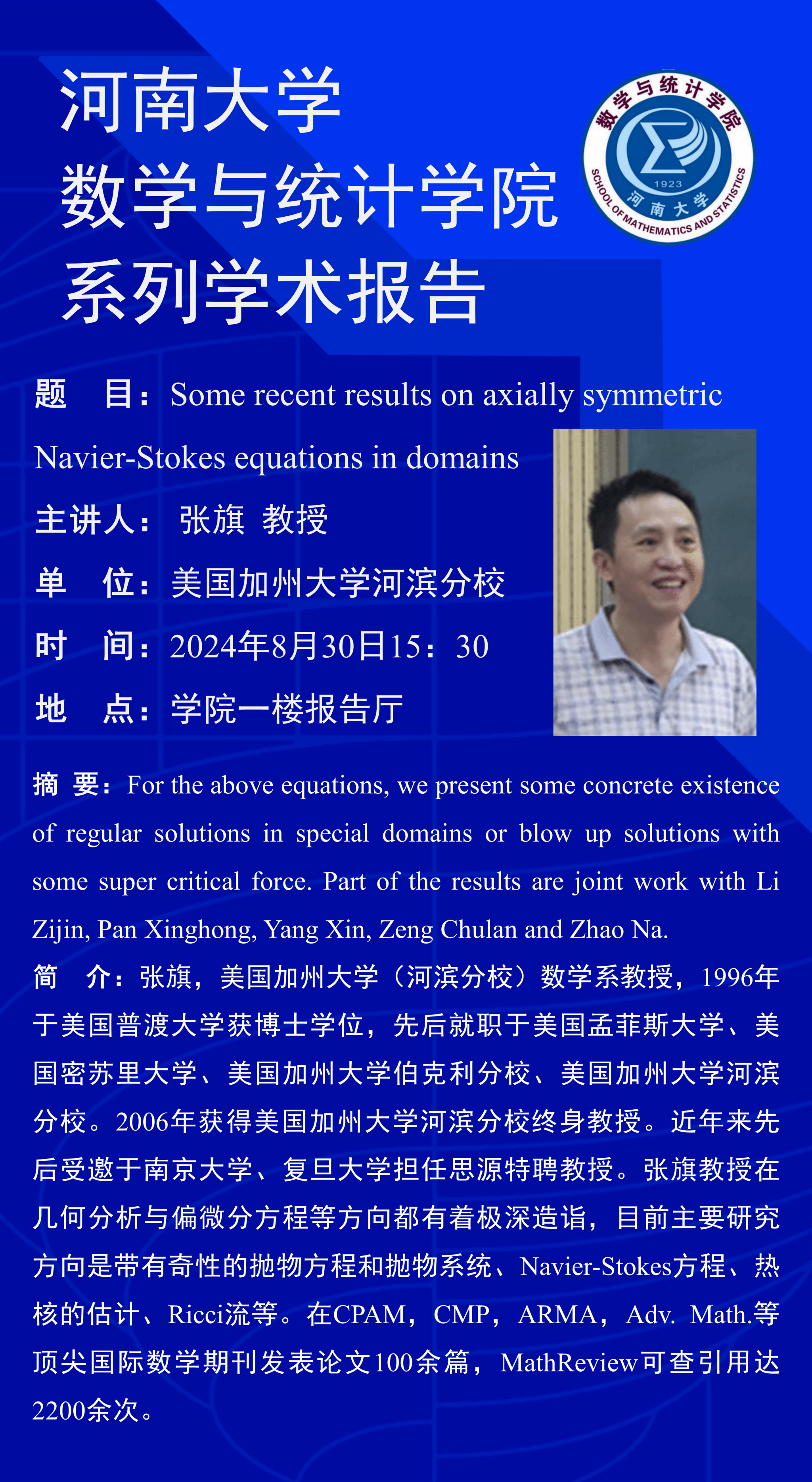 张旗:Some recent results on axially symmetric Navier-Stokes equations in domains(时间:8月30日)