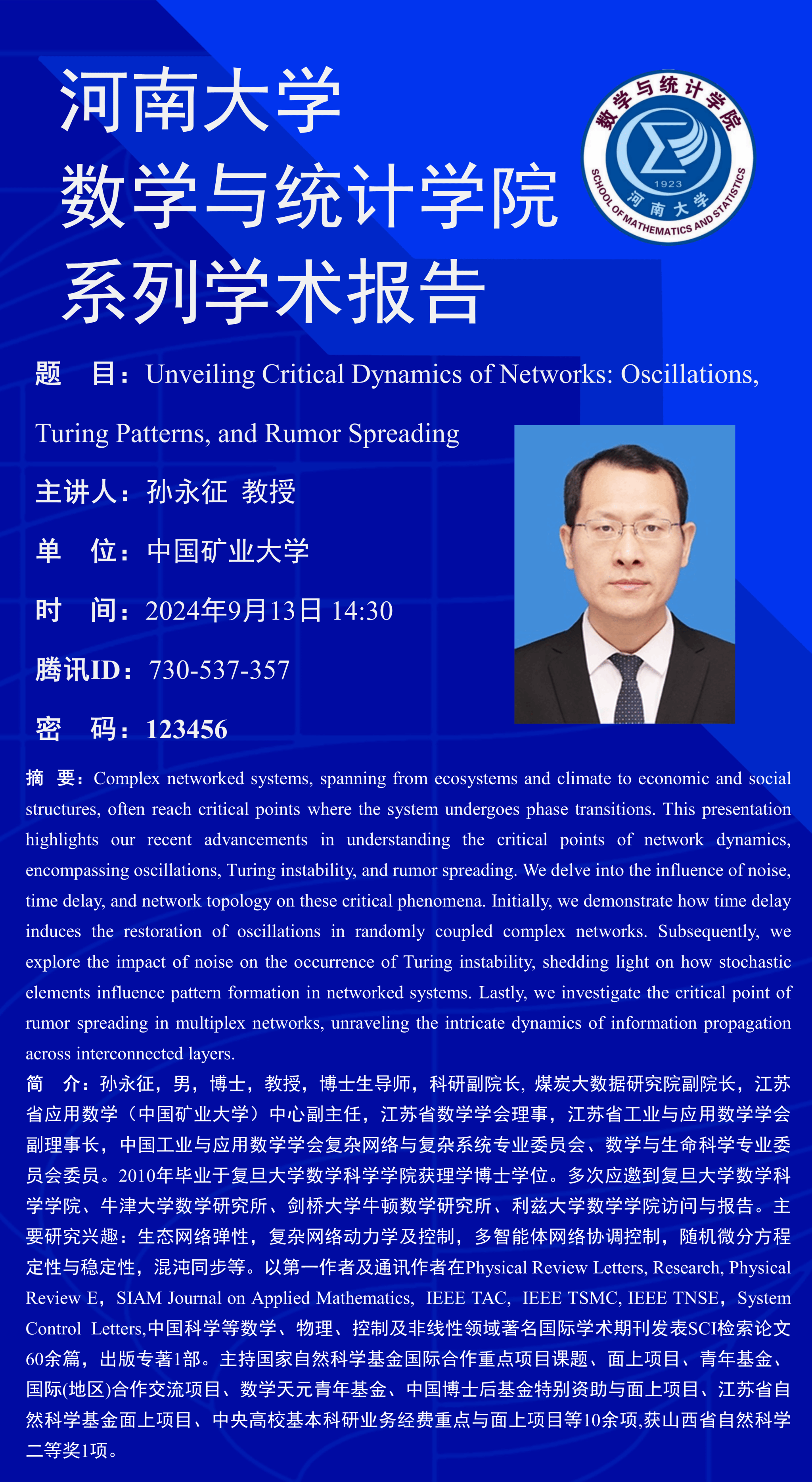 孙永征:Unveiling Critical Dynamics of Networks: Oscillations, Turing Patterns, and Rumor Spreading(时间:9月13日)