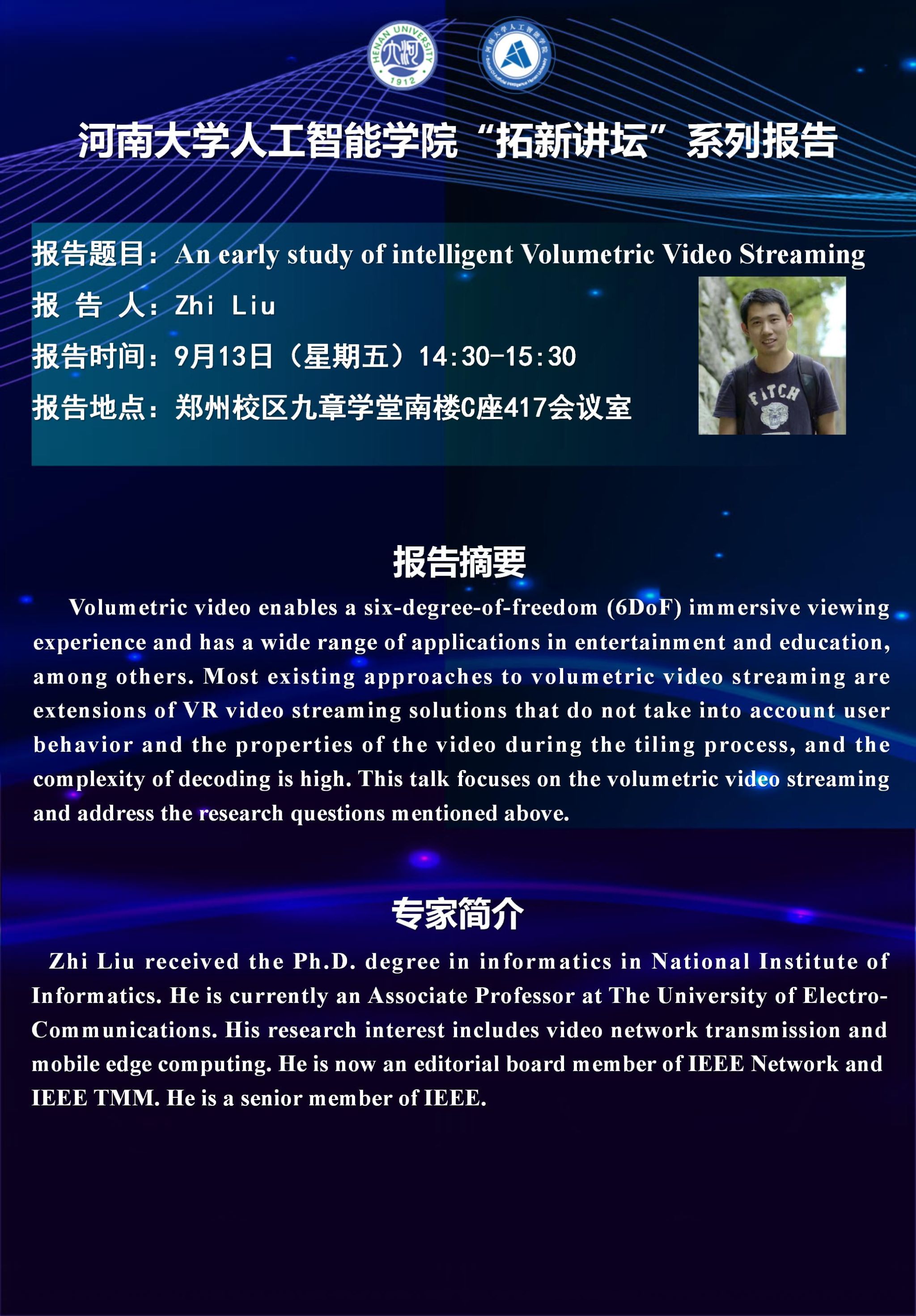 Zhi Liu:An early study of intelligent Volumetric Video Streaming(时间:9月13日)