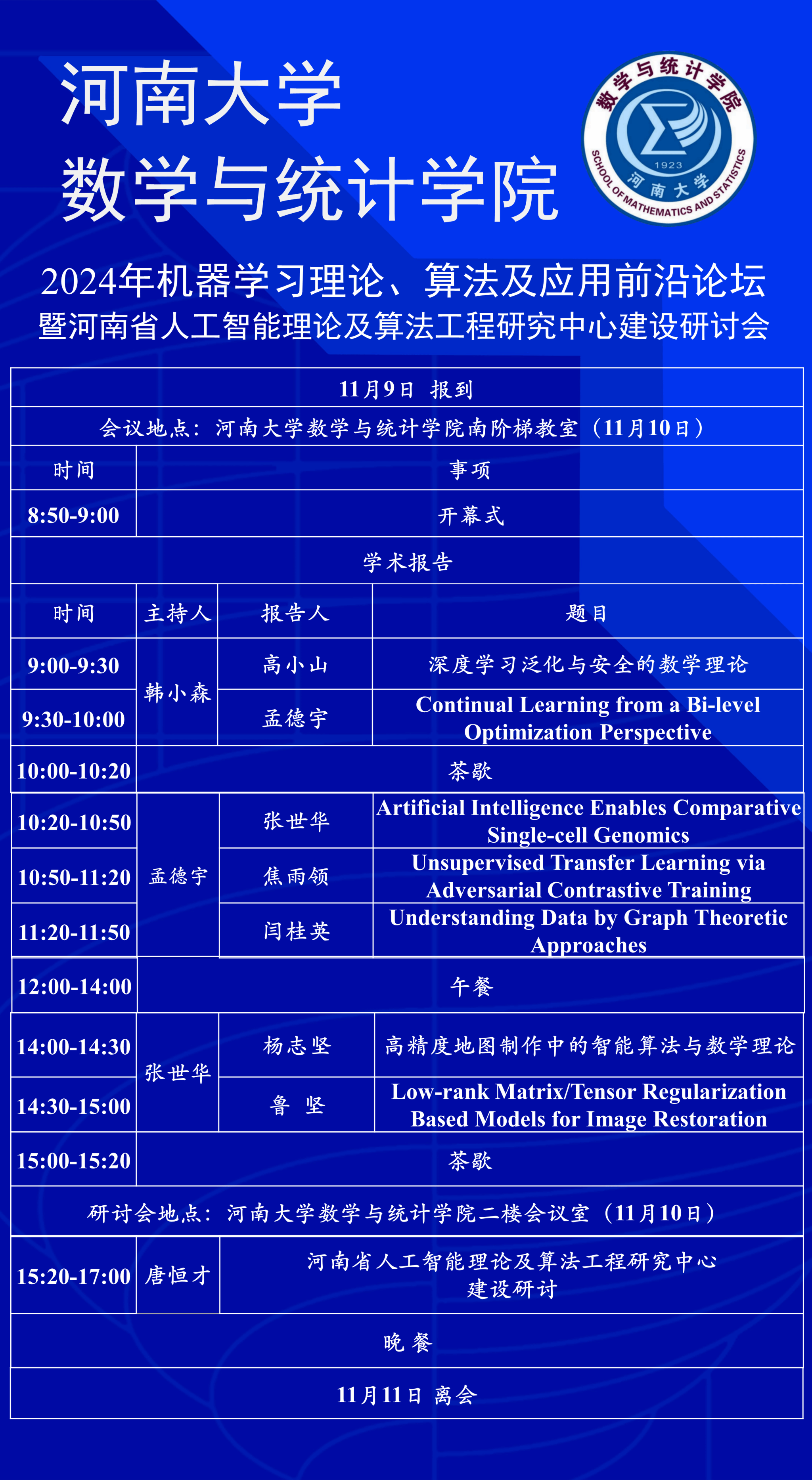 2024年机器学习理论、算法及应用前沿论坛 暨河南省人工智能理论及算法工程研究中心建设研讨会(时间:11月9日-11日)