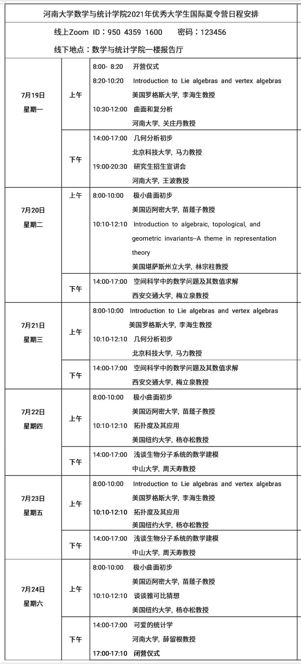 数学与统计学院2021年优秀大学生国际夏令营日程安排(时间7.19)
