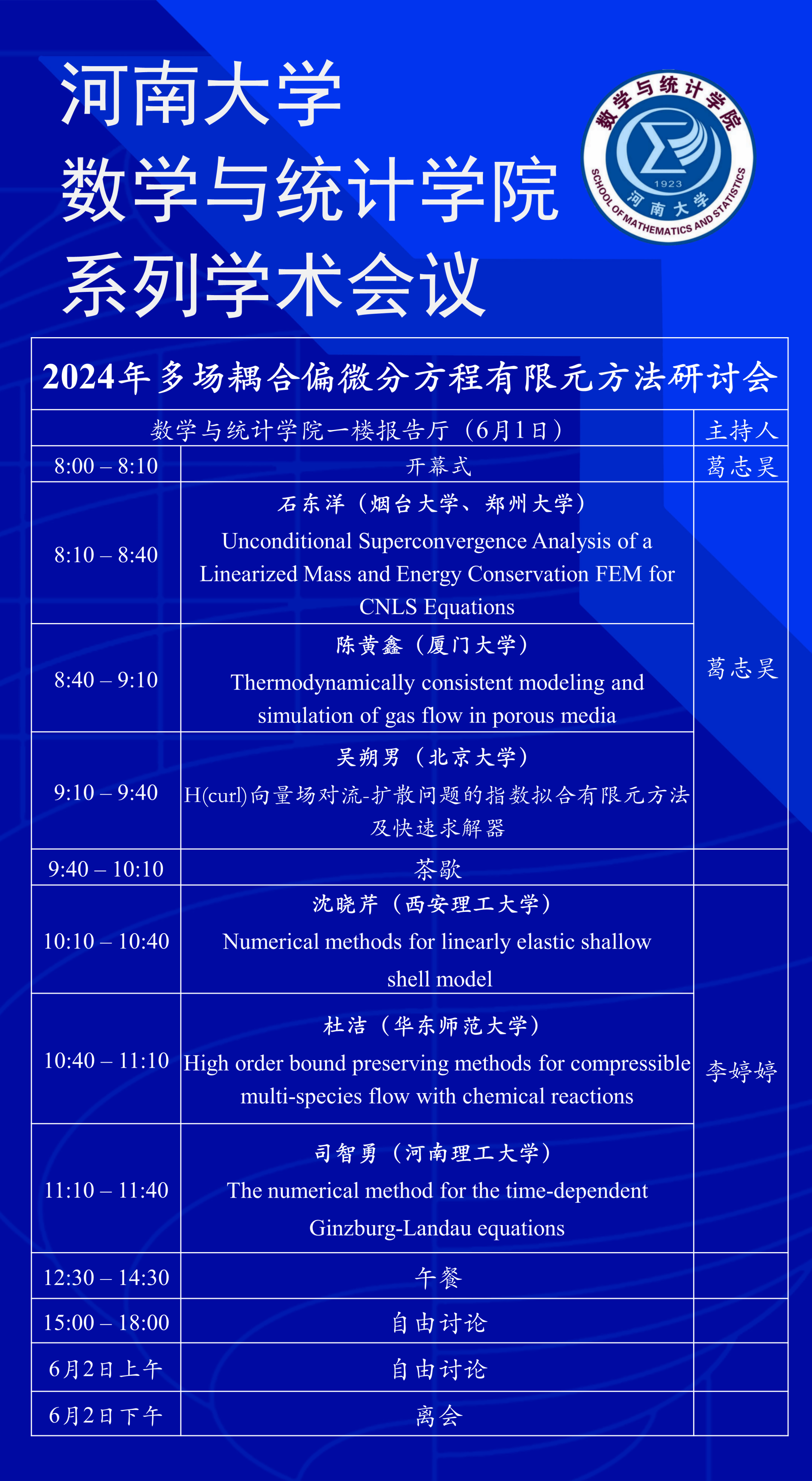 2024年多场耦合偏微分方程有限元方法研讨会(时间:6月1日-6月2日)