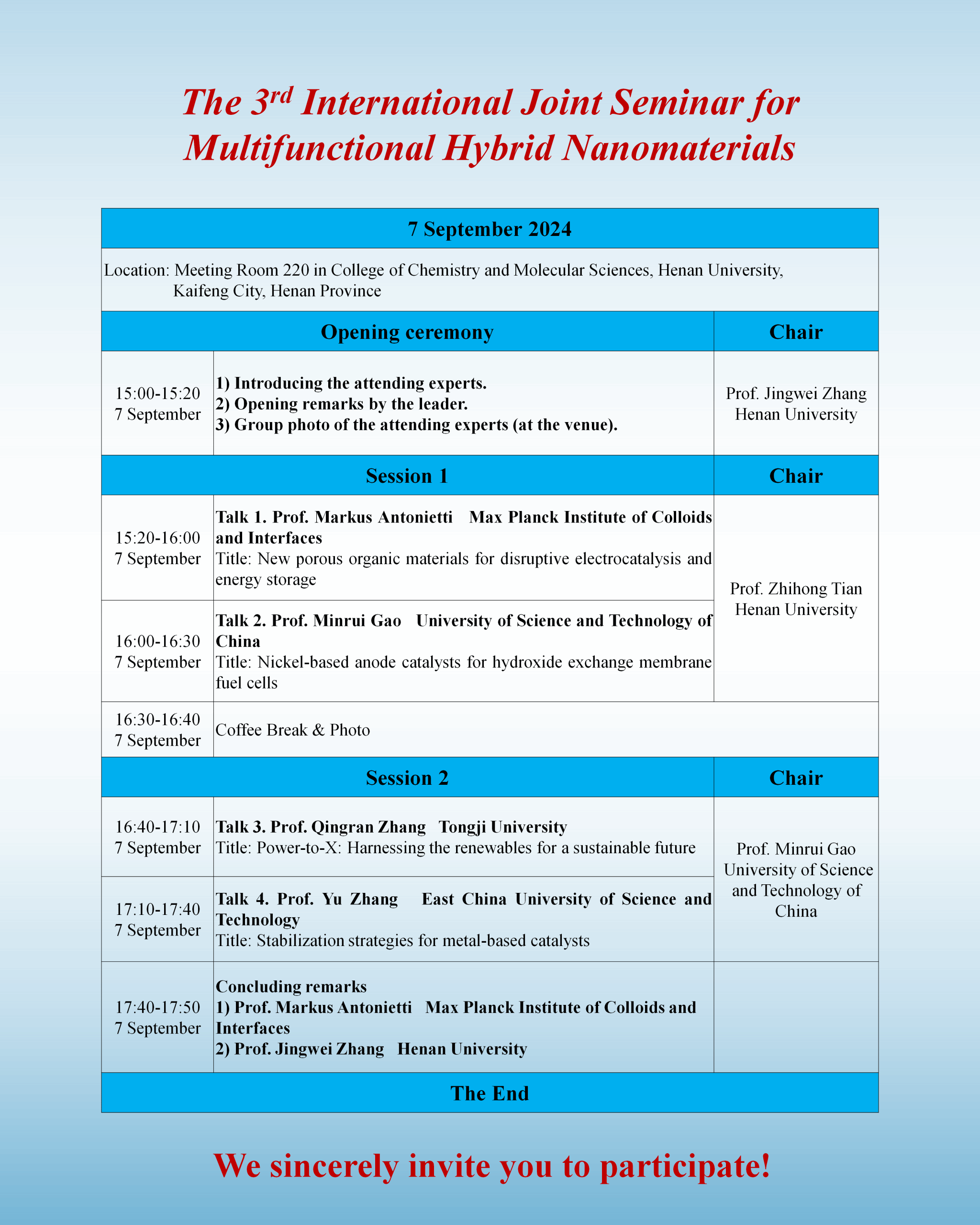 The 3rd International Joint Seminar forMultifunctional Hybrid Nanomaterials(时间:9月7日)