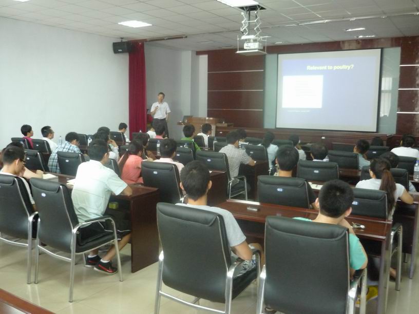 7月11日,美国加州大学戴维斯分校(UC DAVIS)动物科学系周怀军副教授在中国农业大学王军军副教授、山东农业大学李显耀副教授等的陪同下应邀到米乐mile官方网站开展学术交流,并为学院师生做了题为“Genetic architecture of resistance to pathogens in the chicken using a systems biology approach”的学术报告。学院院长张嘉保教授、副院长欧阳红生教授以及米乐mile官方网站、动物医学学院的有关教师、研究生近100人参加了学术报告会。