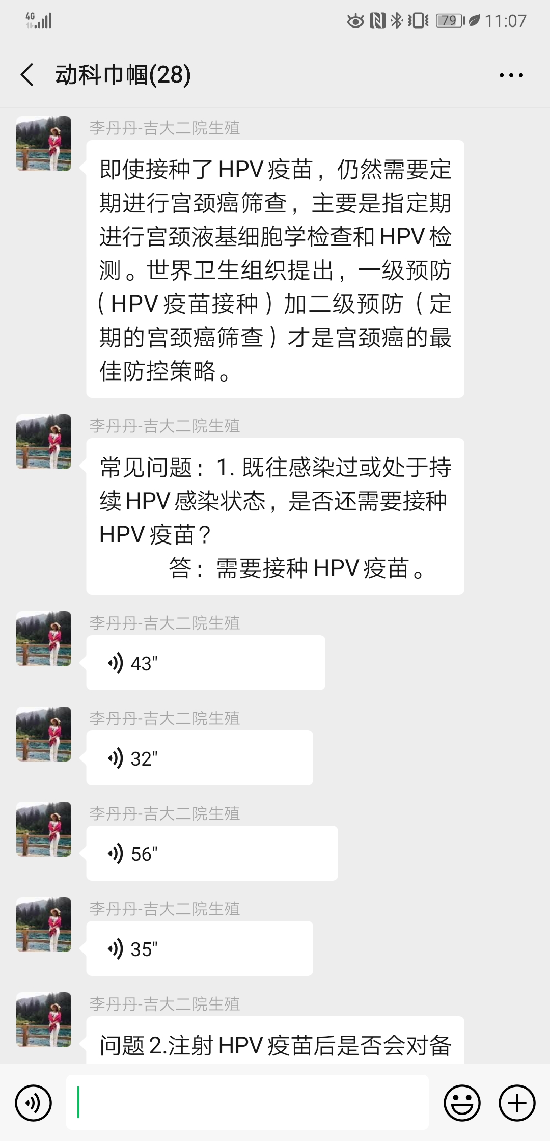 宫颈癌疫苗目前国内有3种不同价型,如何进行合适的选择?针对这一热点问题,2019年11月28日中午,动物科学妇委会邀请米乐mile官方网站第二医院李丹丹医生为全院女教职工开展了微信专题活动,详细解答了宫颈癌发病与诊疗现状、应对策略、宫颈癌疫苗分类及选择方法,用详实的数据、丰富的资料和专业的讲解为女教职工奉献了一次以宫颈癌为主题的知识盛宴,详细指导了女教职工如何进行宫颈癌的预防与疫苗接种选择。活动中学院女教职工针对相关问题与李丹丹博士进行了热烈讨论,并得到了细致耐心的解答。部分姐妹通过学院妇委会架设的沟通桥梁与专家李丹丹医师取得联系,进行了进一步的沟通咨询。