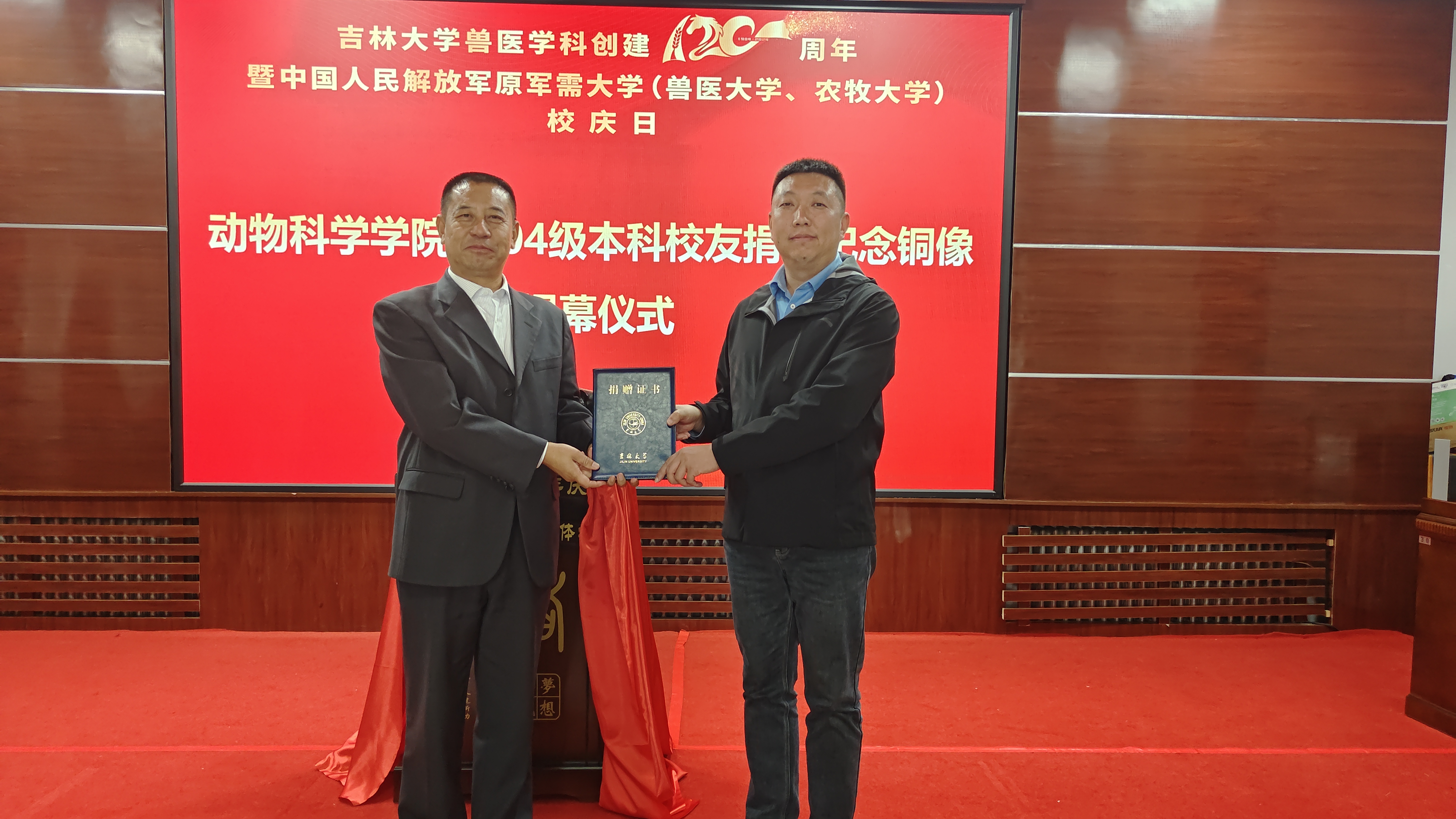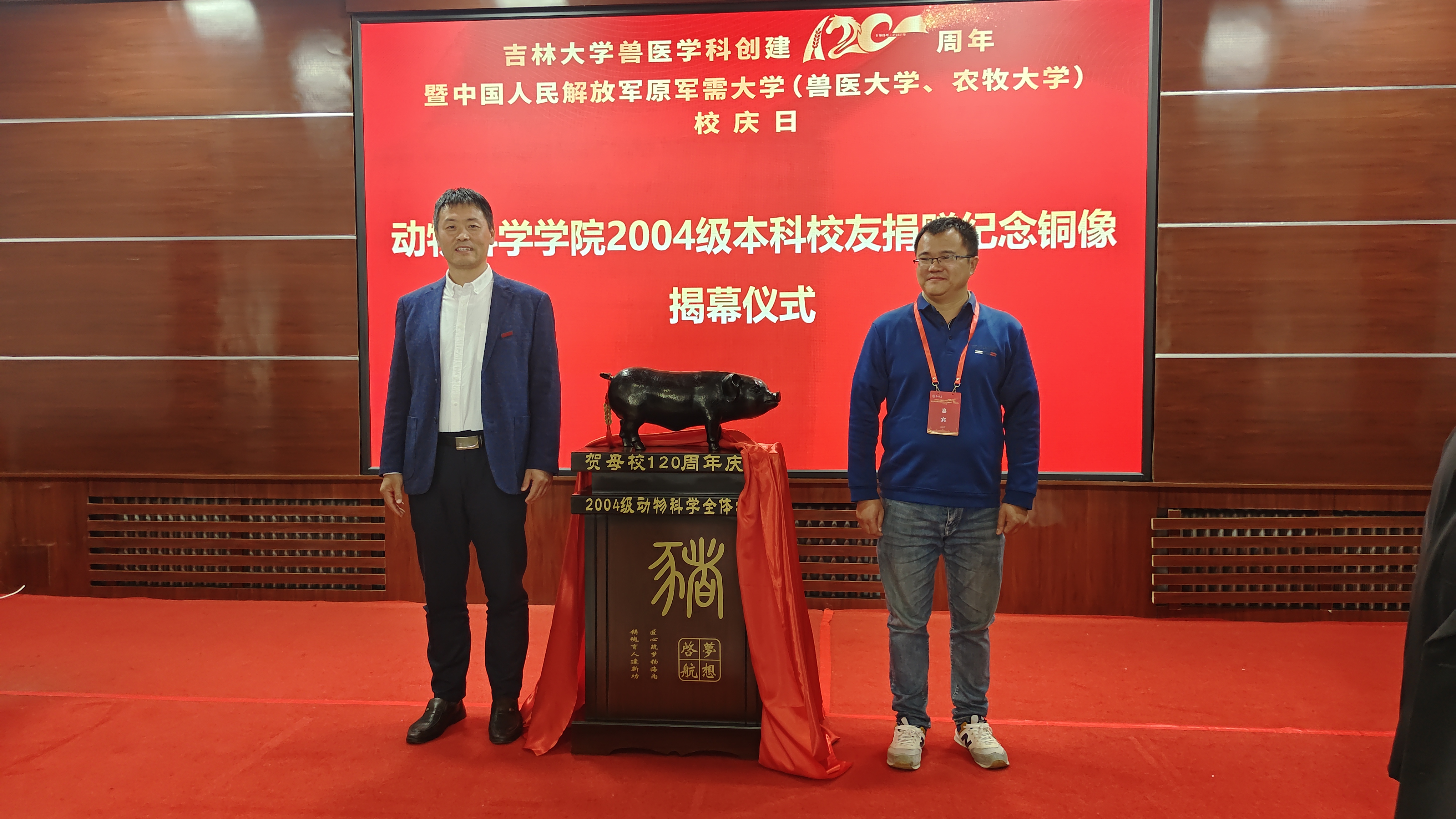 喜迎米乐mile官方网站兽医学科创建120周年暨中国人民解放军原军需大学(兽医大学、农牧大学)校庆,为寄托对母校的深切情谊,感恩母校,传递力量,米乐mile官方网站于9月20日和21日下午分别举办返校校友捐赠仪式。92级校友代表、斯贝福(北京)生物技术有限公司首席执行官战大伟为学院捐赠了齐长庆先生铜像。学院2004级本科生校友为学院捐赠了吉祥物猪铜像和校友基金10000元整。