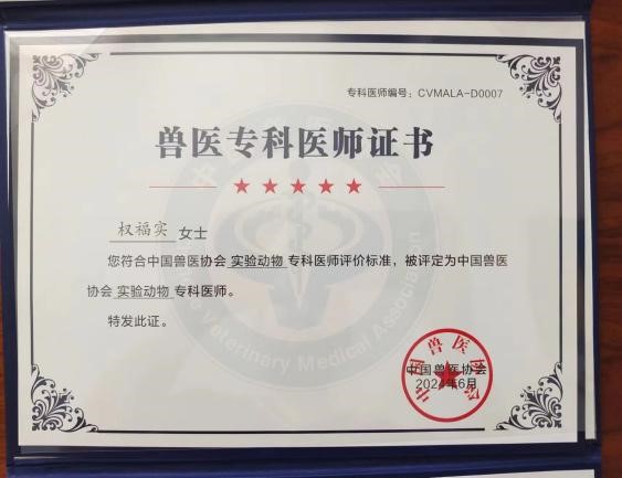 为提升实验动物兽医在饲繁育养、疫病防控、质量管理、福利伦理审查等方面的专业水平,中国兽医协会实验动物专科委员会于2024年6月21日,经中国兽医协会专科建设委员会第八次会议讨论研究,准予成立。论坛期间,举行了实验动物兽医专科建设启动仪式,并为实验动物专科委员会委员代表颁发了证书。中国兽医协会实验动物专科委员会在领域内履行专科人才培养规划、专科培养机构和专科医师评价标准制修订、专科医师培养方案审查、专科医师考核等职责。实验动物专科医师主要负责实验动物设施中动物福利伦理执行情况和实验动物的日常检查、监督、疾病预防诊治和相关的技术咨询等工作,在实验动物行业是一个至关重要的角色。权福实副教授成为中国兽医协会实验动物专科委员会委员并被评选为第一批实验动物专科医师。