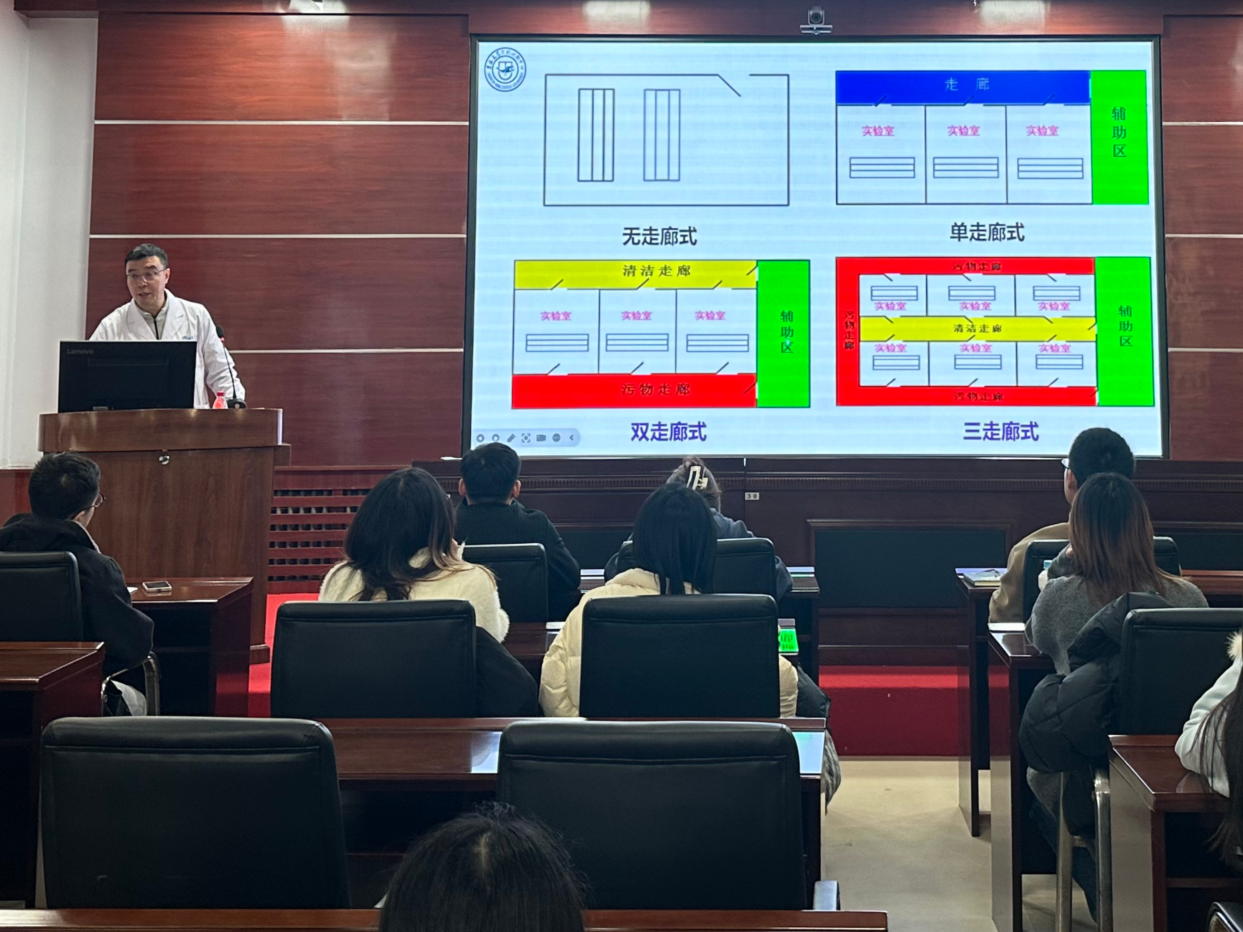 胡进平老师作了《实验动物屏障环境设施准入培训》的相关报告,为参加培训的同学们讲解了在屏障环境设施中人员、物品、动物等进出/传入传出流程、人员标准化的操作规程、生物安全的相关知识以及实验室安全操作的注意事项。