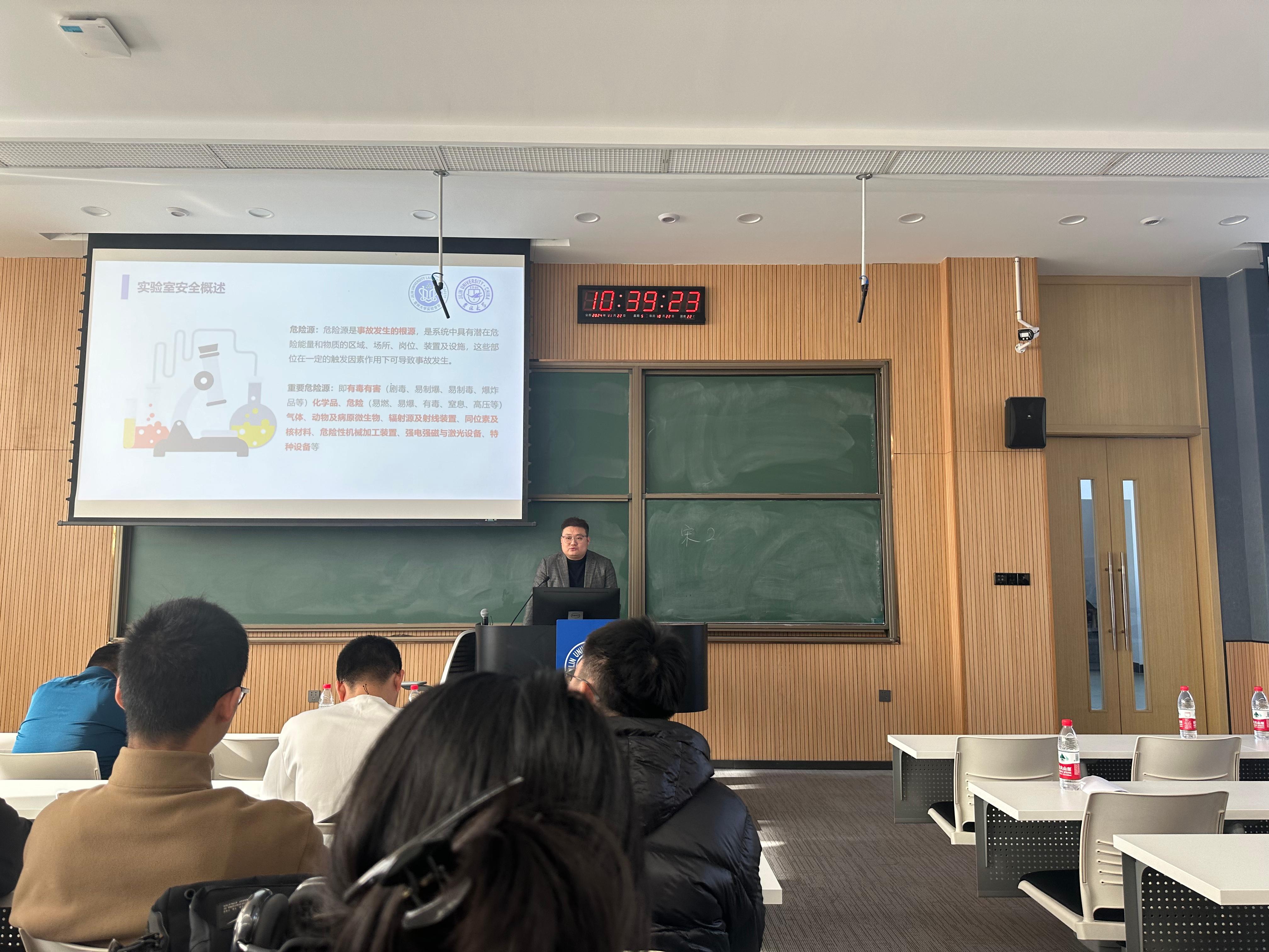 侯震科长从实验室安全概述、实验室安全管理体系、实验室安全教育、实验室安全分级分类、实验室安全检查、实验室危险废物管理几个方面向同学们介绍了实验室安全的注意事项,用生动的宣传片演示了实验室操作规范,讲解了在实验室中如何确保实验人员的安全与健康,防止事故发生,以保障科研工作的顺利进行。