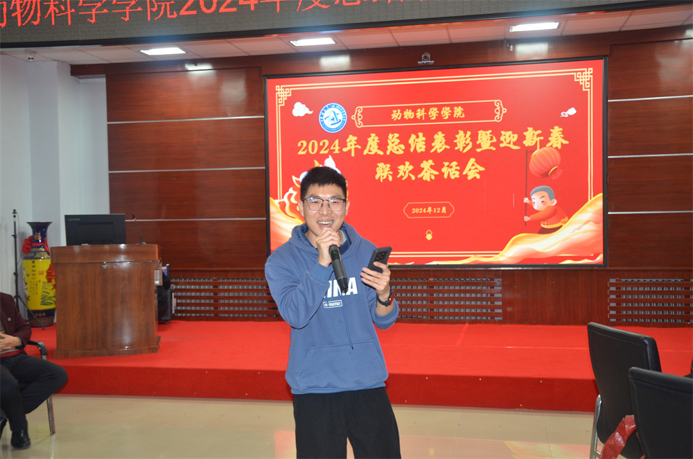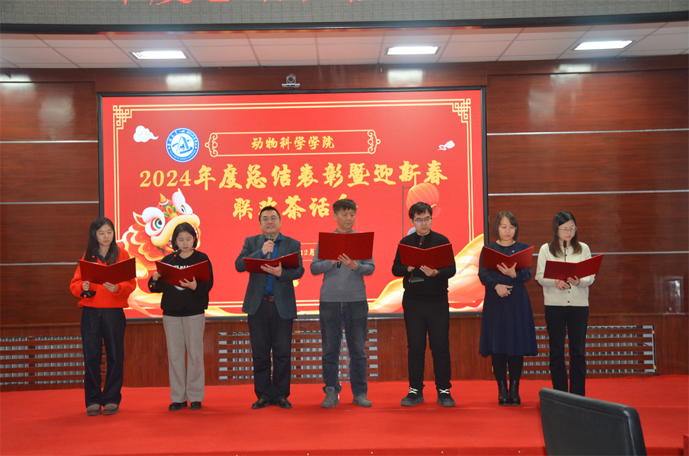 最后,学院迎新春联欢茶话会在师生精心准备的节目表演和“默契接力”“蒙眼踏步”等互动游戏的轻松氛围中拉开帷幕。实验教学中心的老师们以一曲《小美满》手势舞表达了对学院师生的新年祝福,生物技术系博士后钱育强高歌一曲《天高地厚》诉说着对科研梦想的坚持,实验动物系教师们以一首《无奋斗,不青春》配乐诗朗诵寄语学院师生,让青春在奋斗中绽放光芒,学院机关3位教职工用方言朗诵经典《再别康桥》,唤起了大家对家乡方言的记忆和情感。表演和游戏中还穿插了抽奖环节,师生欢聚,惊喜连连,相信在新的一年里,学院师生将继续保持饱满的热情和昂扬的斗志,为学院“双一流”建设和高质量发展蓄势赋能,做出新的贡献。