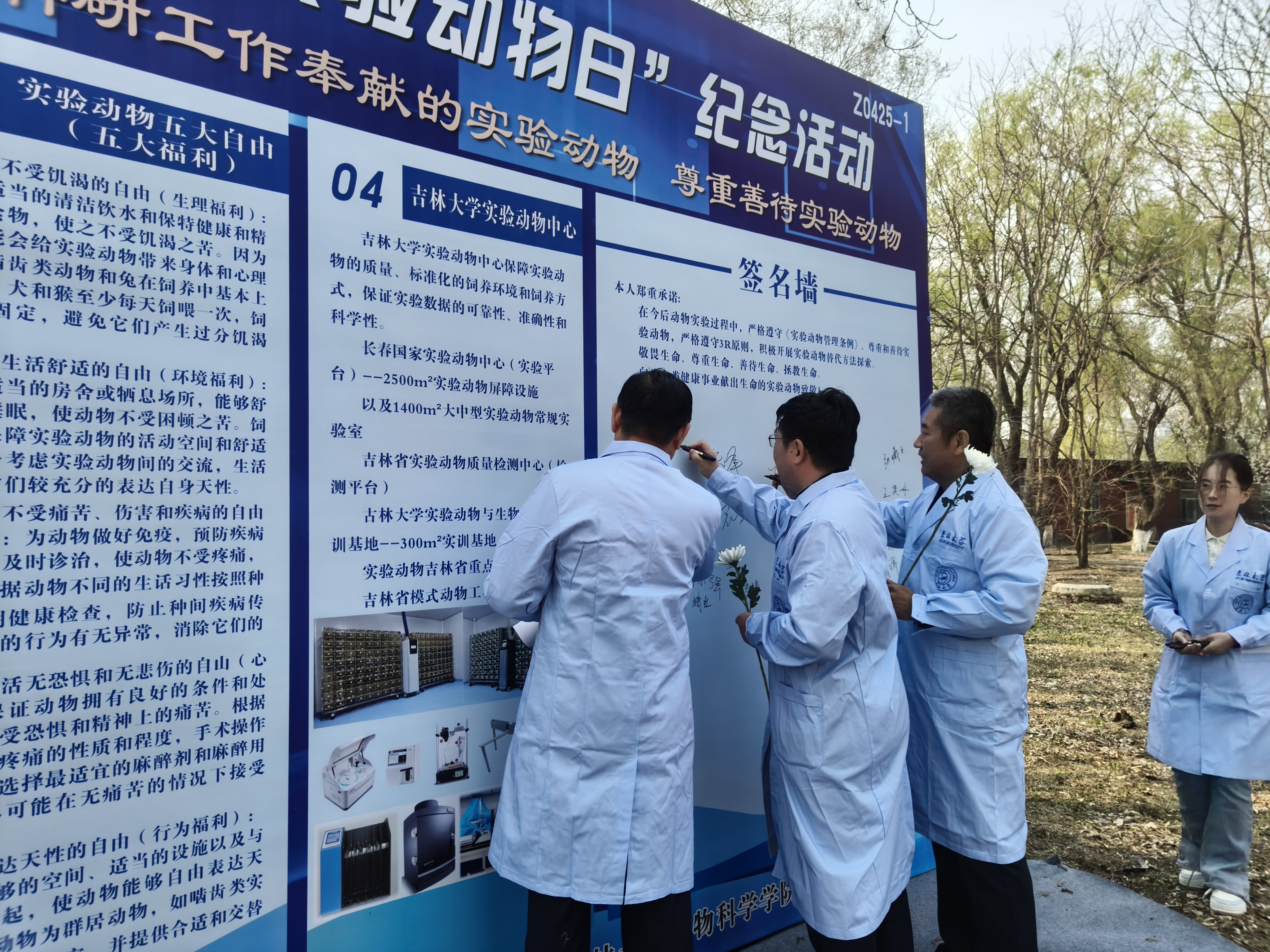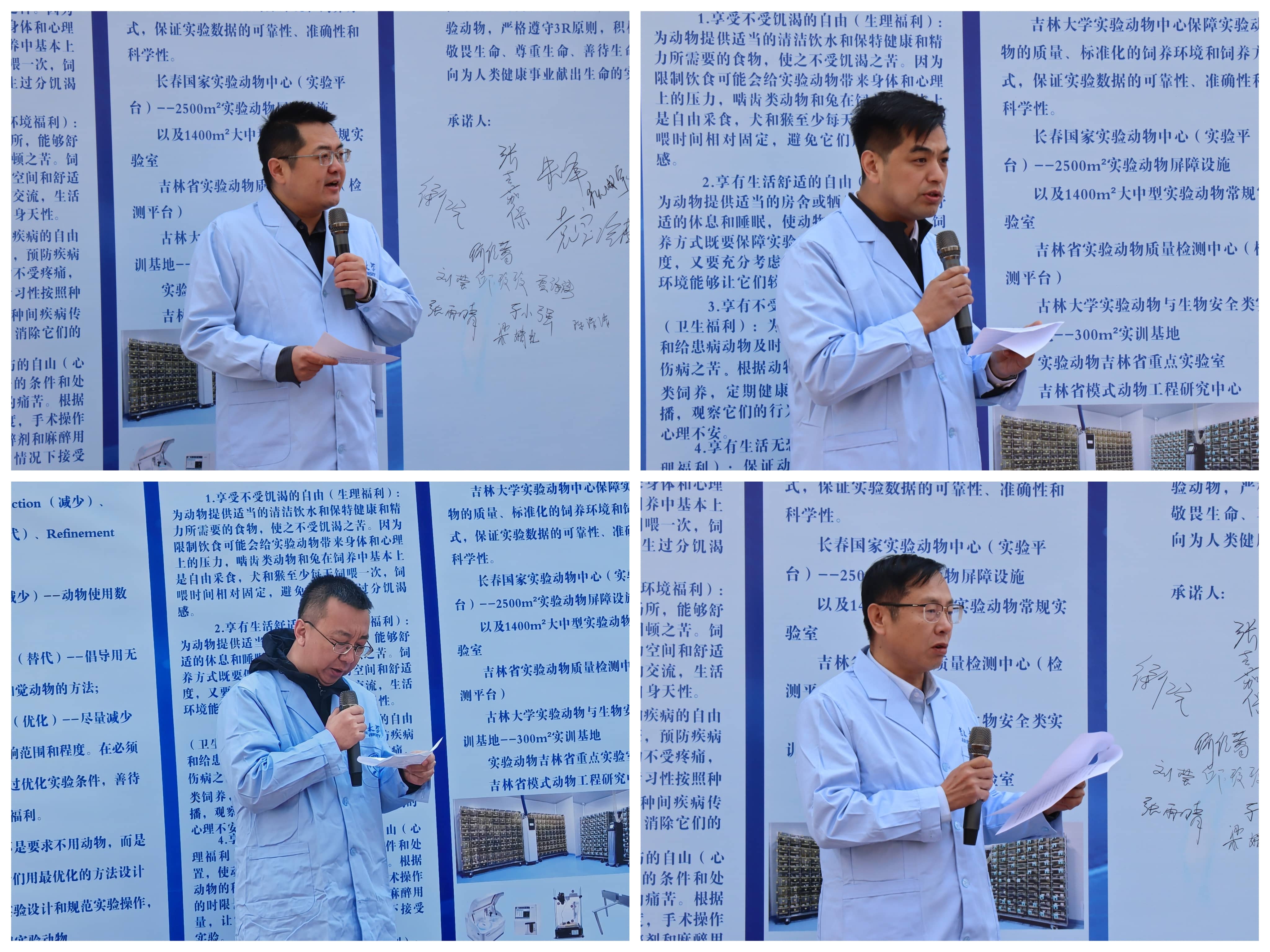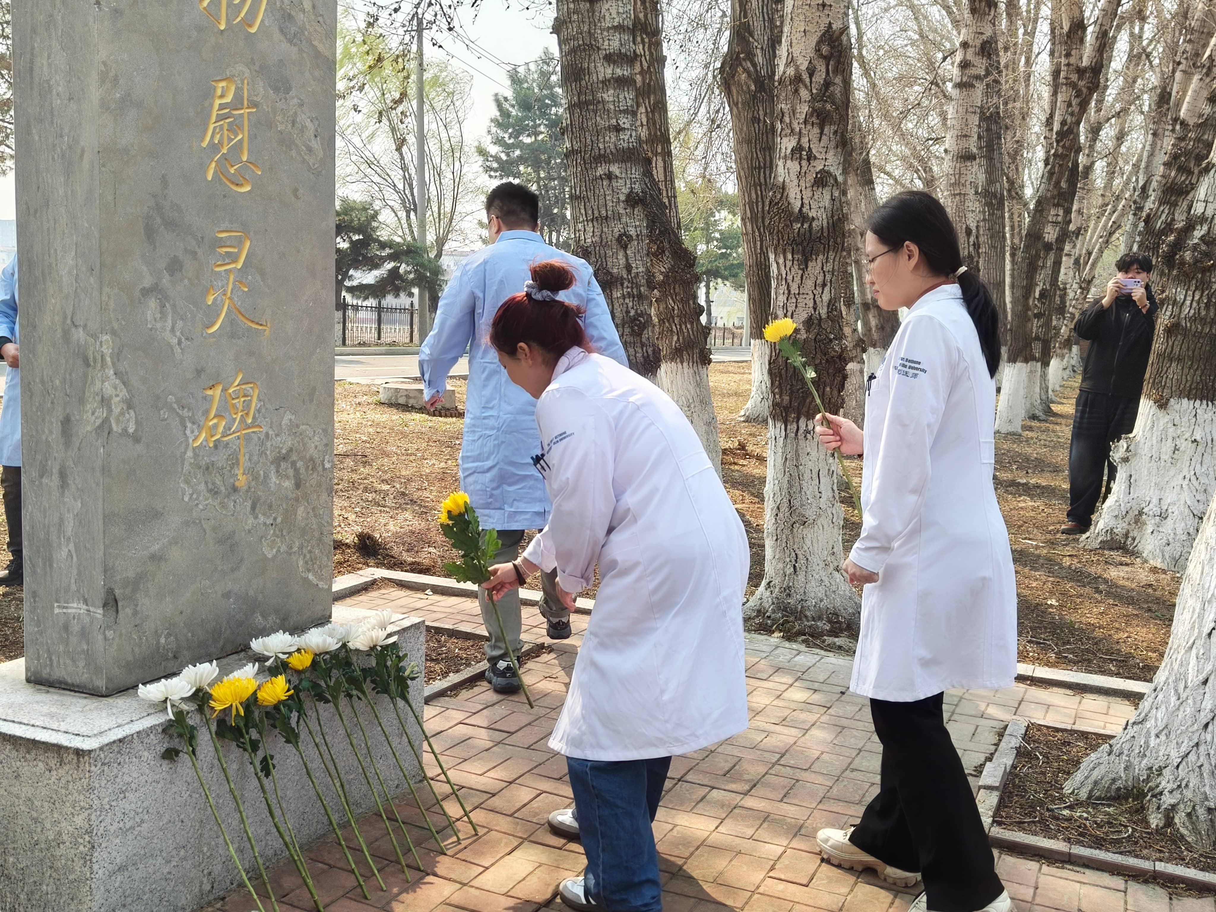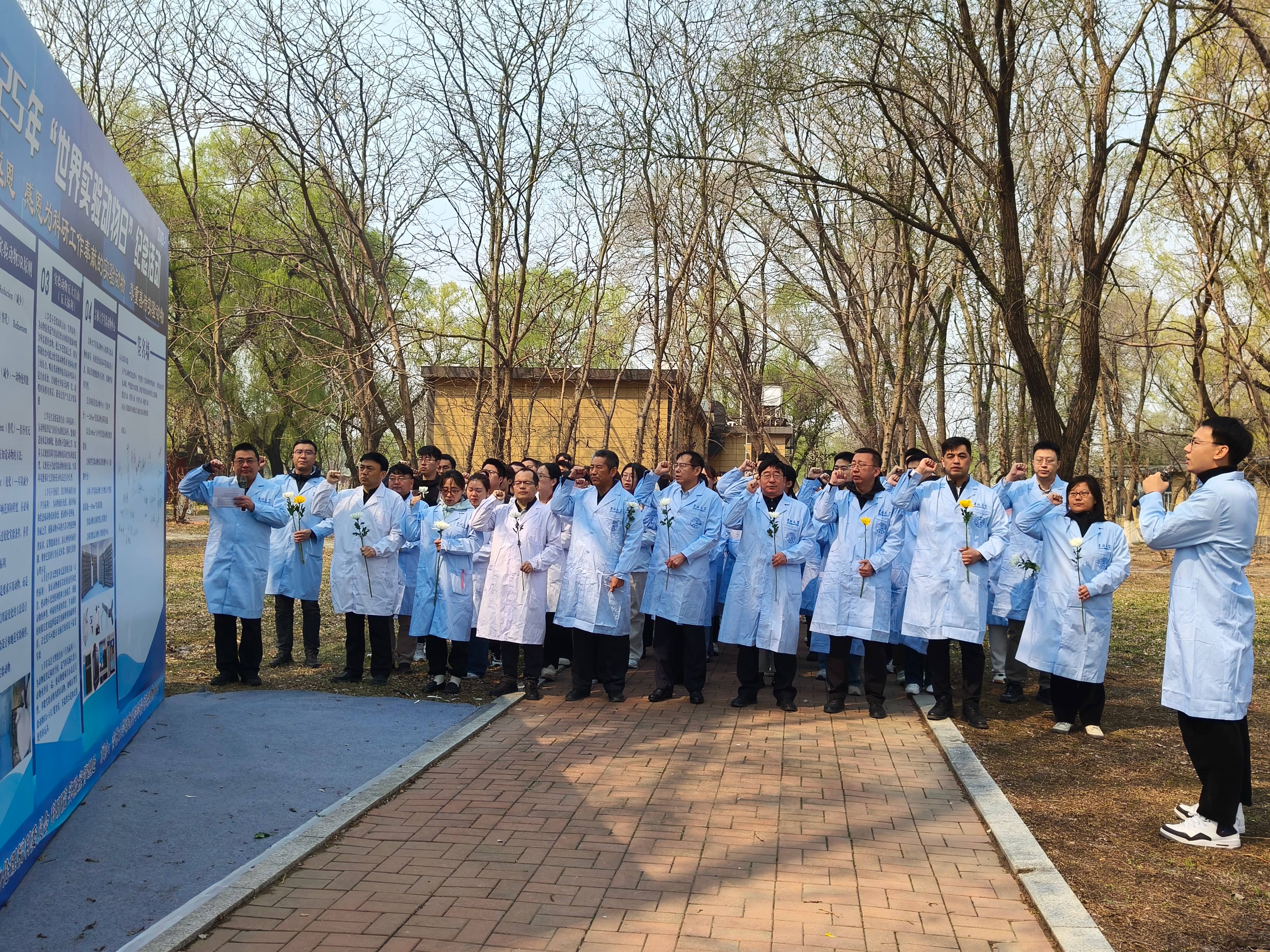 最后,全体师生共同宣誓并依次向实验动物慰灵碑敬献鲜花,瞻仰碑文,致敬为人类健康事业献出宝贵生命的实验动物。