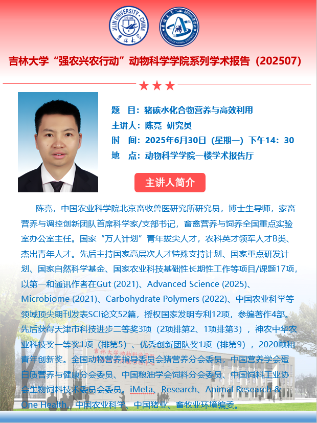 陈亮,中国农业科学院北京畜牧兽医研究所研究员,博士生导师,家畜营养与调控创新团队首席科学家/支部书记,畜禽营养与饲养全国重点实验室办公室主任。国家“万人计划”青年拔尖人才,农科英才领军人才B类、杰出青年人才。先后主持国家高层次人才特殊支持计划、国家重点研发计划、国家自然科学基金、国家农业科技基础性长期性工作等项目/课题17项,以第一和通讯作者在Gut (2021)、Advanced Science (2025)、Microbiome (2021)、Carbohydrate Polymers (2022)、中国农业科学等领域顶尖期刊发表SCI论文52篇,授权国家发明专利12项,参编著作4部。先后获得天津市科技进步二等奖3项(2项排第2、1项排第3),神农中华农业科技奖一等奖1项(排第5)、优秀创新团队奖1项(排第9),2020颐和青年创新奖。全国动物营养指导委员会猪营养分会委员,中国营养学会蛋白质营养与健康分会委员、中国粮油学会饲料分会委员、中国饲料工业协会生物饲料技术委员会委员。iMeta、Research、Animal Research & One Health、中国农业科学、中国猪业、畜牧业环境编委。