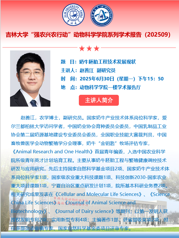 赵善江,农学博士,副研究员。国家奶牛产业技术体系岗位科学家,爱尔兰都柏林大学访问学者,中国奶业协会育种委员会委员,中国乳制品工业协会第二届奶源基地建设专业委员会委员,全国职业技能大赛裁判员,中国畜牧兽医学会动物繁殖学分会理事,奶牛“金钥匙”牧场评估专家,《Animal Research and One Health》首届青年编委,入选中国农业科学院所级青年英才计划培育工程。主要从事奶牛胚胎工程与繁殖健康调控技术研发与应用研究,先后主持国家自然科学基金项目2项、国家奶牛产业技术体系岗位科学家1项,国家级农业重大科技课题1项、科技创新2030-国家农业重大项目课题1项,宁夏自治区重点研发计划1项,院所基本科研业务费2项,参与省部级以上科研项目6项。相关研究成果发表在《Cellular and Molecular Life Sciences》、《Science China Life Sciences》、《Journal of Animal Science and Biotechnology》、《Journal of Dairy science》等期刊;以第一发明人授权发明专利2项,实用新型专利4项;以第2完成人制订国家标准1项;主编著作1部,获省部级奖项2项,担任多部杂志审稿专家、国家自然科学基金委项目评审专家。