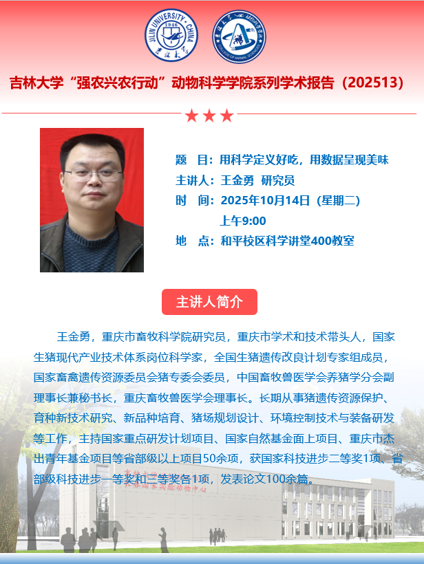 王金勇,重庆市畜牧科学院研究员,重庆市学术和技术带头人,国家生猪现代产业技术体系岗位科学家,全国生猪遗传改良计划专家组成员,国家畜禽遗传资源委员会猪专委会委员,中国畜牧兽医学会养猪学分会副理事长兼秘书长,重庆畜牧兽医学会理事长。长期从事猪遗传资源保护、育种新技术研究、新品种培育、猪场规划设计、环境控制技术与装备研发等工作,主持国家重点研发计划项目、国家自然基金面上项目、重庆市杰出青年基金项目等省部级以上项目50余项,获国家科技进步二等奖1项、省部级科技进步一等奖和三等奖各1项,发表论文100余篇。