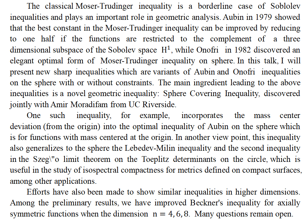 桂长峰,美国德州大学圣安东尼奥分校(University of Texas at San Antonion)的Dan Parman Endowed Professor。1984年在北京大学获学士学位,1987年在北京大学获硕士学位,1991年在美国明尼苏达大学获得博士学位。曾任纽约大学库郎研究所讲师,加拿大哥伦比亚大学助理教授、副教授,美国康尼迪格大学副教授、教授。2013年评选为美国数学会会士,曾获得加拿大太平洋数学研究所研究成果奖,加拿大数学中心Aisensdadt奖,IEEE最佳论文奖,中国国家自然科学基金海外合作基金。他主要从事偏微分方程理论研究,特别在Allen-Cahn方程的研究,Moser-Trudinger不等式最佳常数的猜想等方面取得了一系列在国际上有重大影响的工作,在国际一流数学学术期刊发表论文50余篇,其中包括 Annals of Mathematics, Inventiones Mathematicae等顶级期刊。