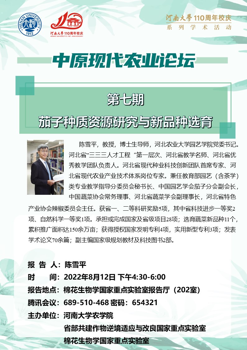yl7703永利官网110周年校庆学术活动:中原现代农业论坛:茄子种质资源研究与新品种选育(时间8.12)