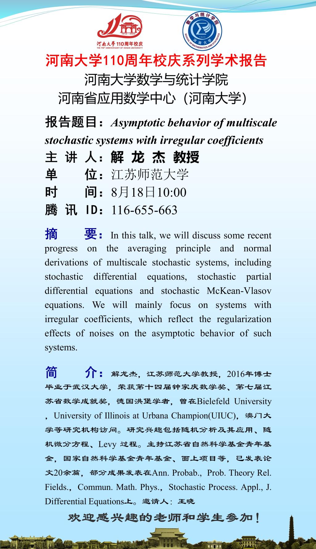 yl7703永利官网110周年校庆学术活动:解龙杰:Asymptotic behavior of multiscale stochastic systems with irregular coefficients(时间8.18)