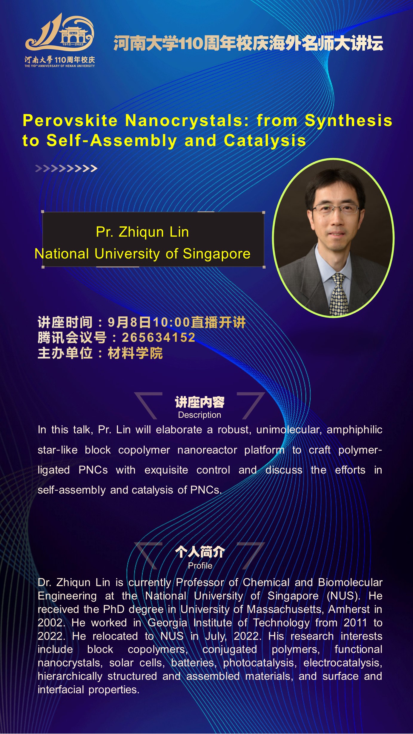 110周年校庆海外名师大讲坛:Perovskite Nanocrystals:from Synthesis to Self-Assembly and Catalysis(时间9.8)
