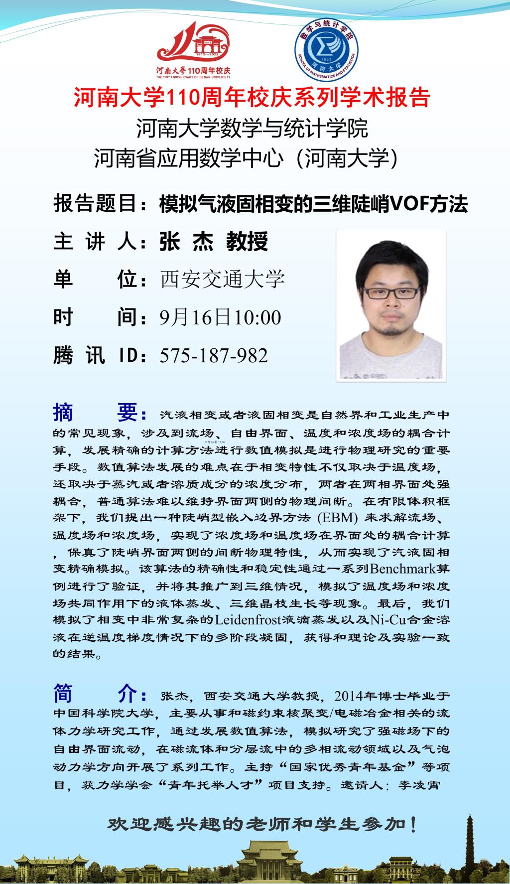 110周年校庆学术活动:张杰:模拟气液固相变的三维陡峭VOF方法(时间9.16)