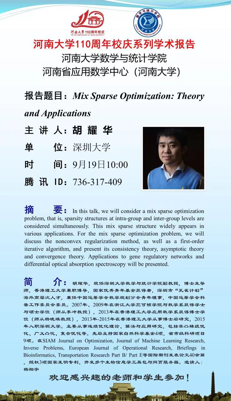 yl7703永利官网110周年校庆系列学术报告之Mix Sparse Optimization: Theory and Applications(9.19)