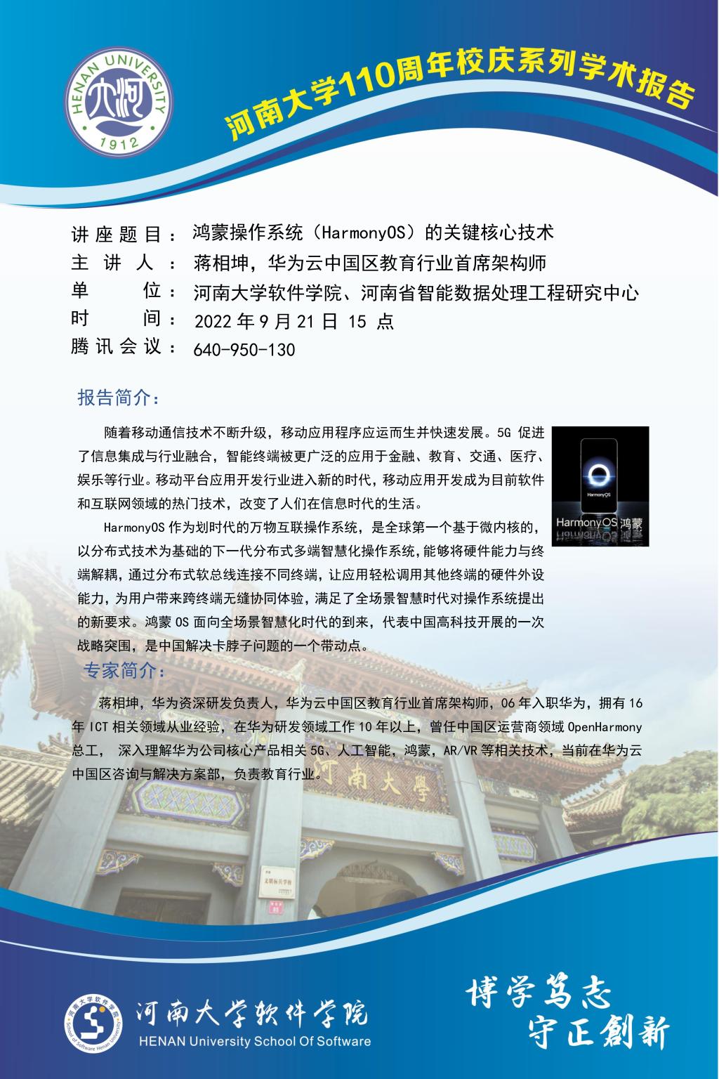 yl7703永利官网110周年校庆系列学术报告:鸿蒙操作系统(HarmonyOS)的关键核心技术(9月21日)