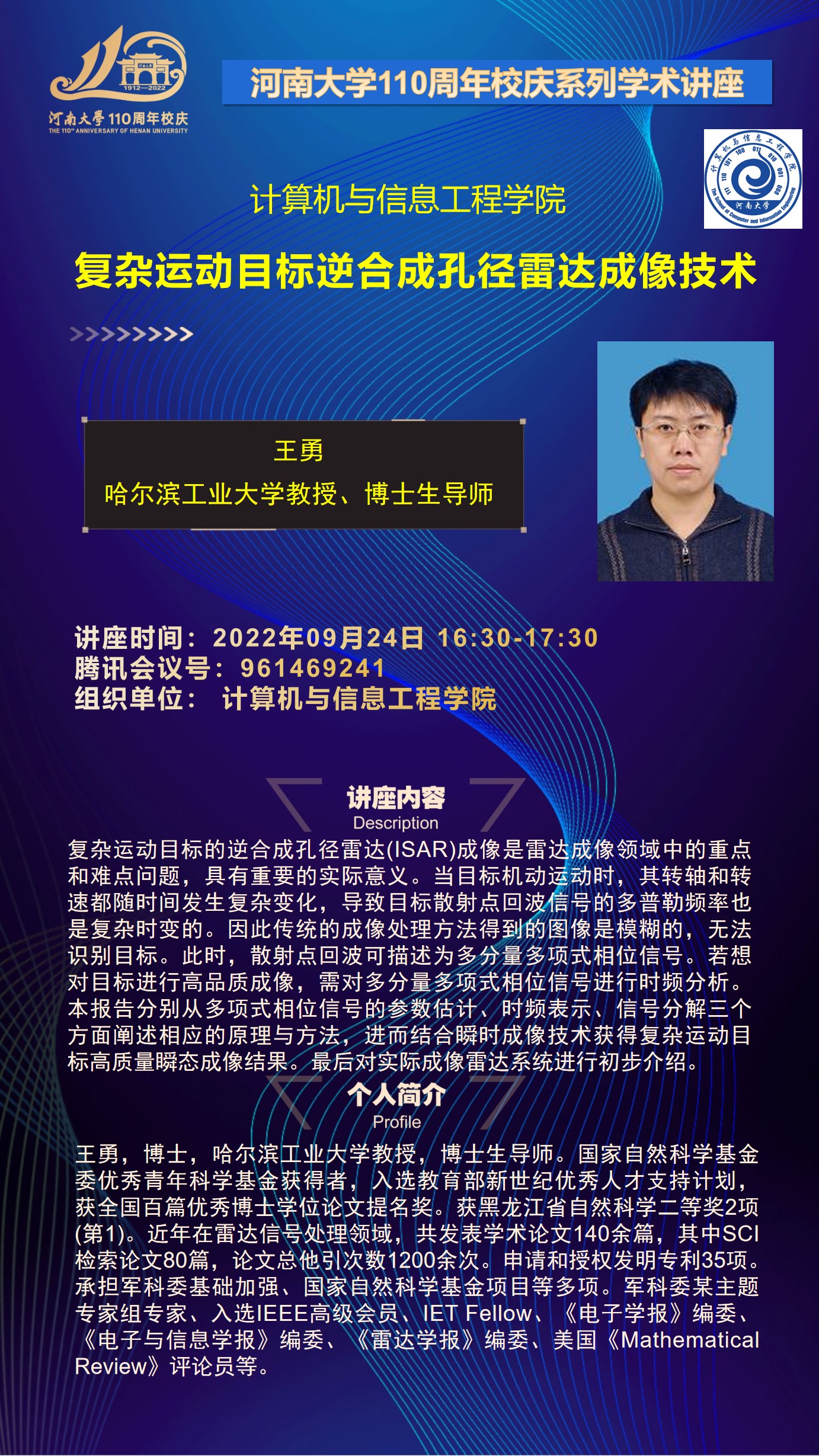 校庆学术活动:王勇:复杂运动目标逆合成孔径雷达成像技术(时间9.24)