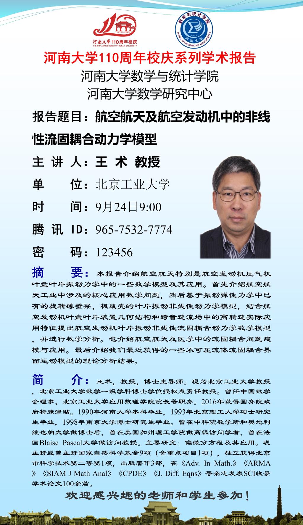 校庆学术活动:王术:航空航天及航空发动机中的非线性流固耦合动力学模型(时间9.24)
