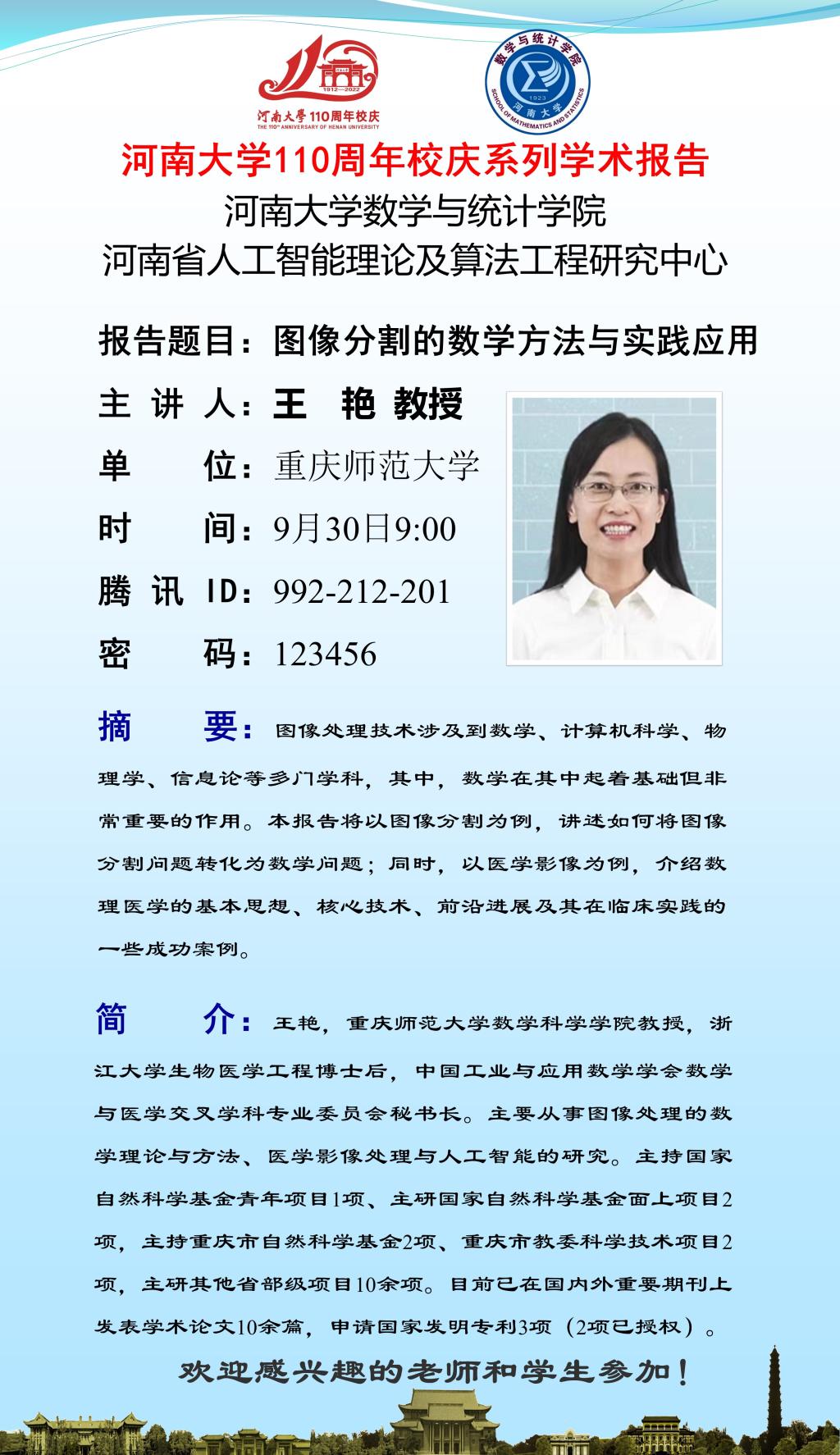 校庆学术活动:王艳:图像分割的数学方法与实践应用(时间9.30)