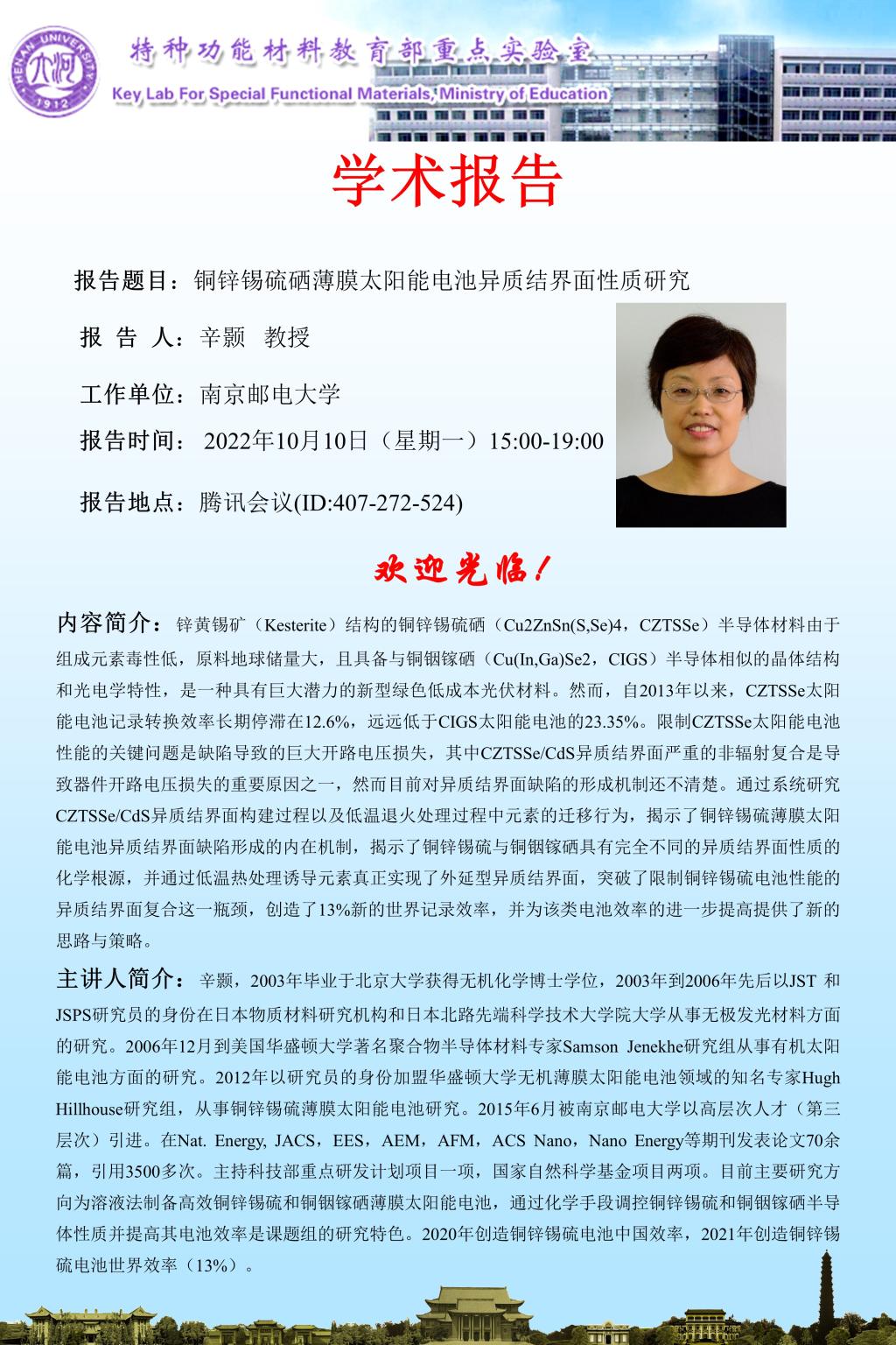辛颢:铜锌锡硫硒薄膜太阳能电池异质结界面性质研究(时间10.10)