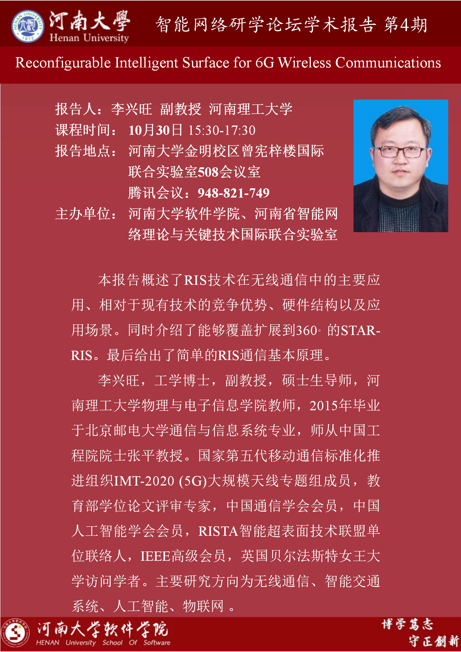 李兴旺:Reconfigurable Intelligent Surface for 6G Wireless Communications (时间:10.30)