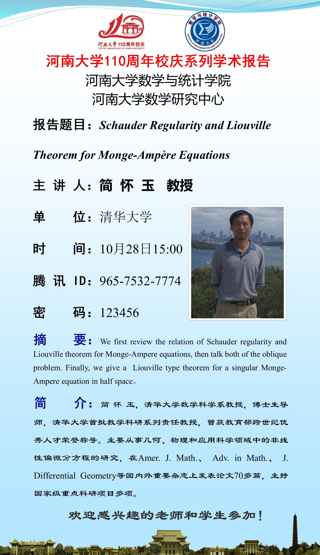 简怀玉:Schauder Regularity and Liouville Theorem for Monge-Ampere Equations(时间 10.28)
