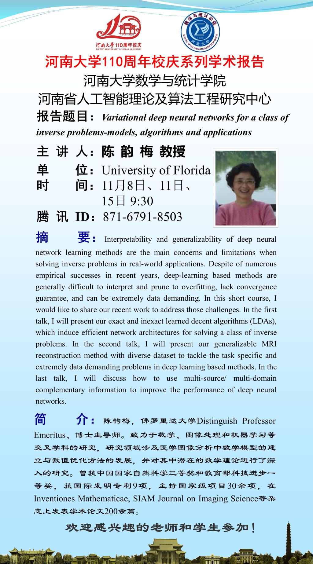 陈韵梅 教授:Variational deep neural networks for a class of inverse problems – models, algorithms and applications(11.8/11/15)