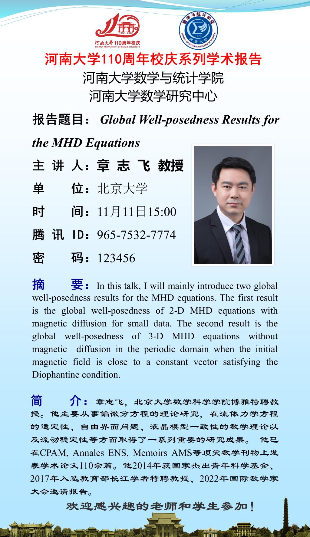 章志飞教授:Global Well-posedness Results for the MHD Equations(时间:11.11)