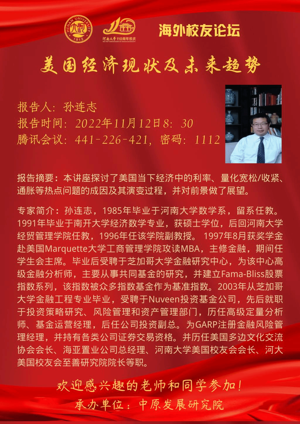 110周年校庆海外校友论坛:孙连志:美国经济现状及未来趋势(时间11.12)