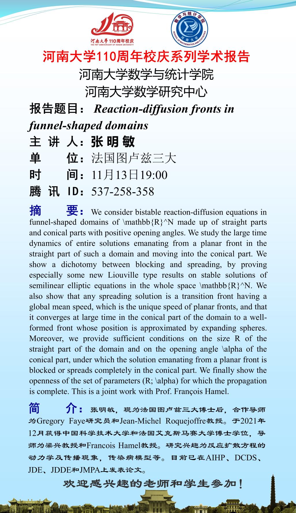 张明敏:Reaction-diffusion fronts in funnel-shaped domains(时间:11.13)
