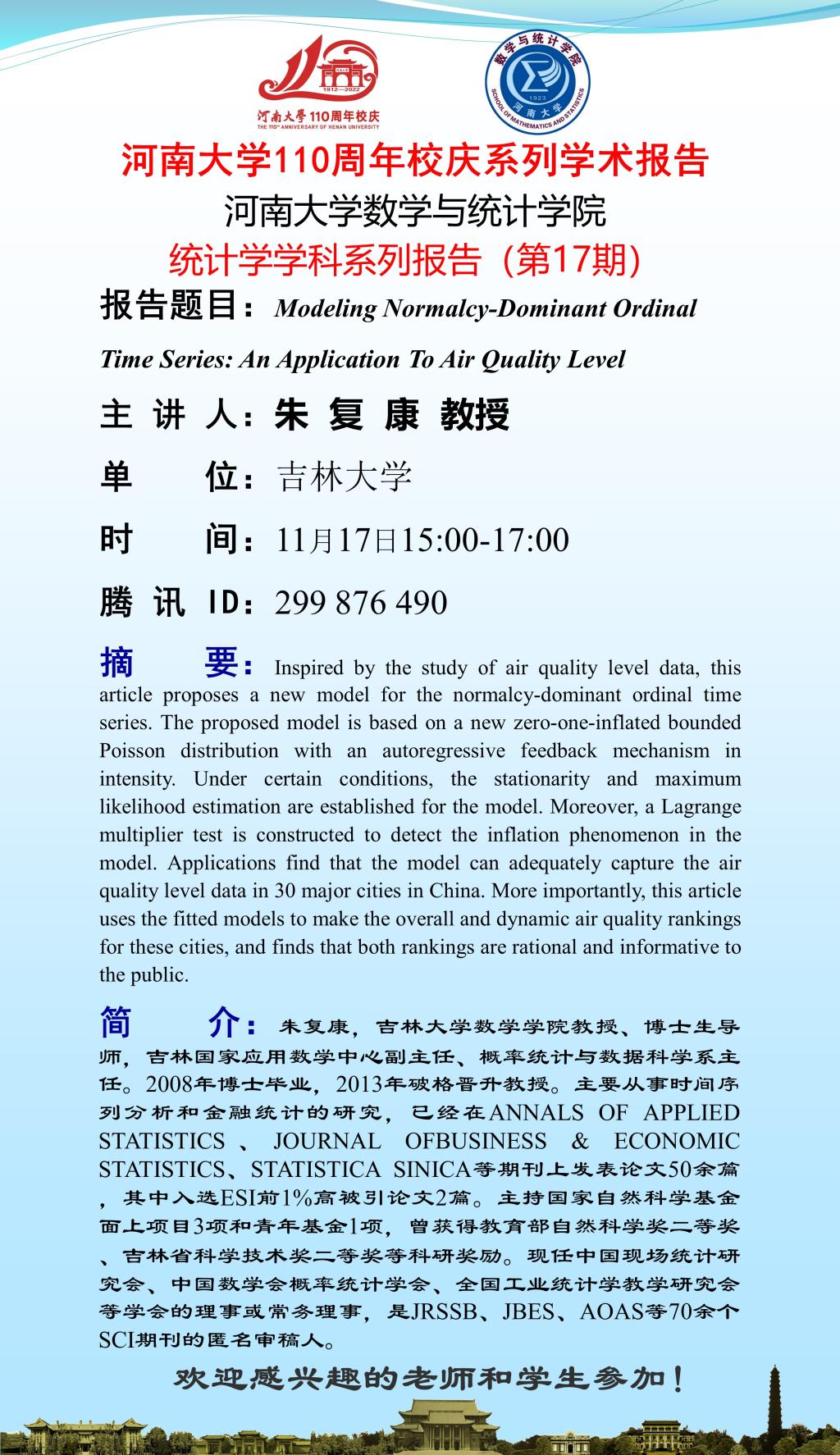 朱复康:Modeling Normalcy-Dominant Ordinal Time Series: An Application To Air Quality Level(时间:11.17)