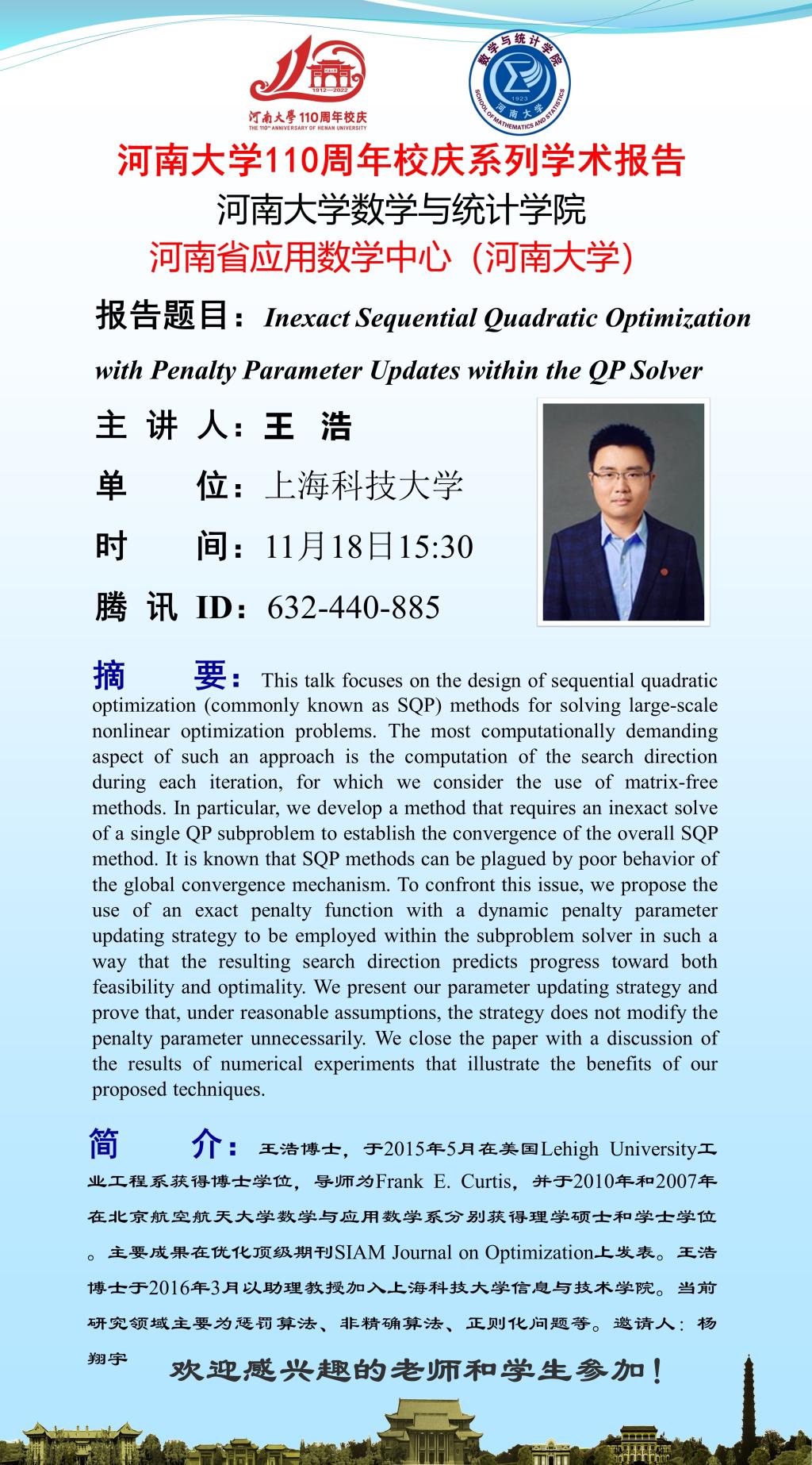 王浩:Inexact Sequential Quadratic Optimization with Penalty Parameter Updates within the QP Solver(时间:11.18)