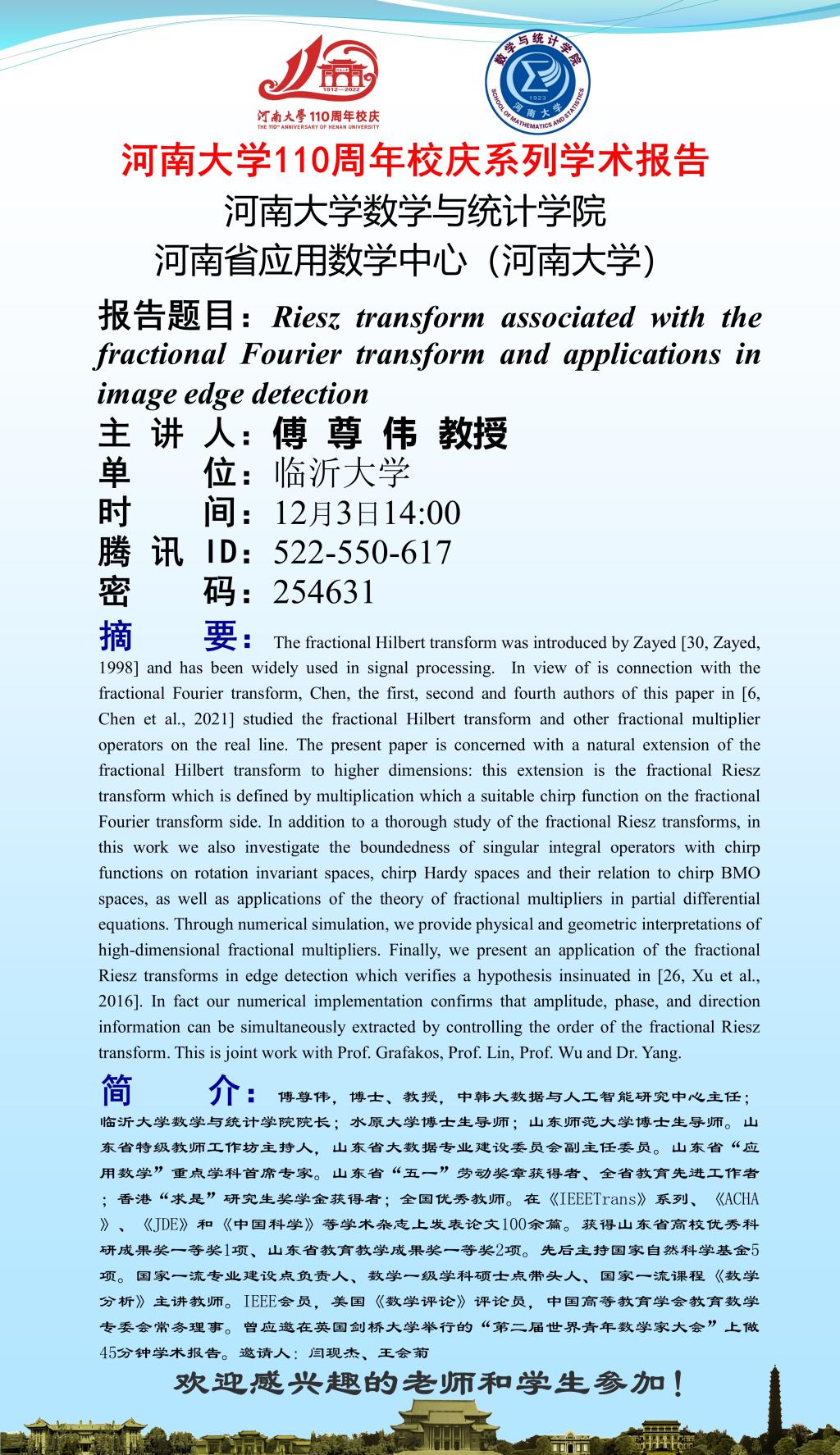 傅尊伟:Riesz transform associated with the fractional Fourier transform and applications in image edge detection(时间:12.3)