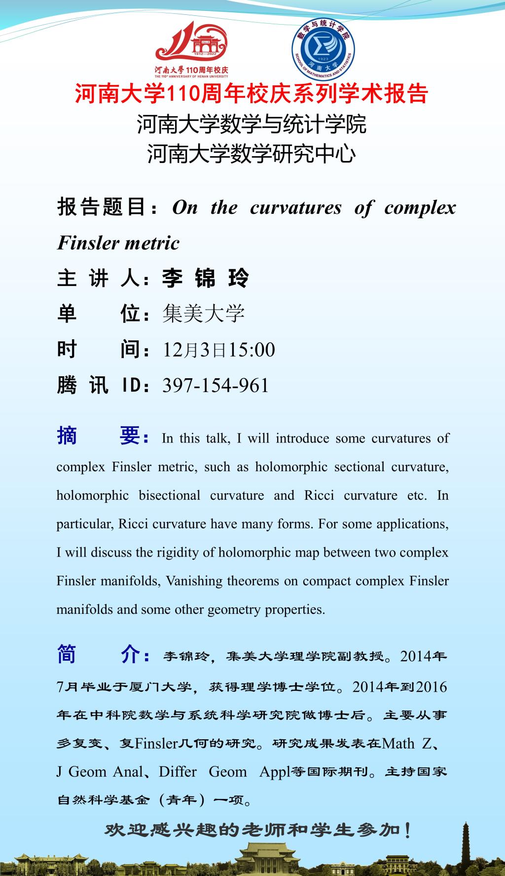 李锦玲:On the curvatures of complex Finsler metric(时间:12.3)
